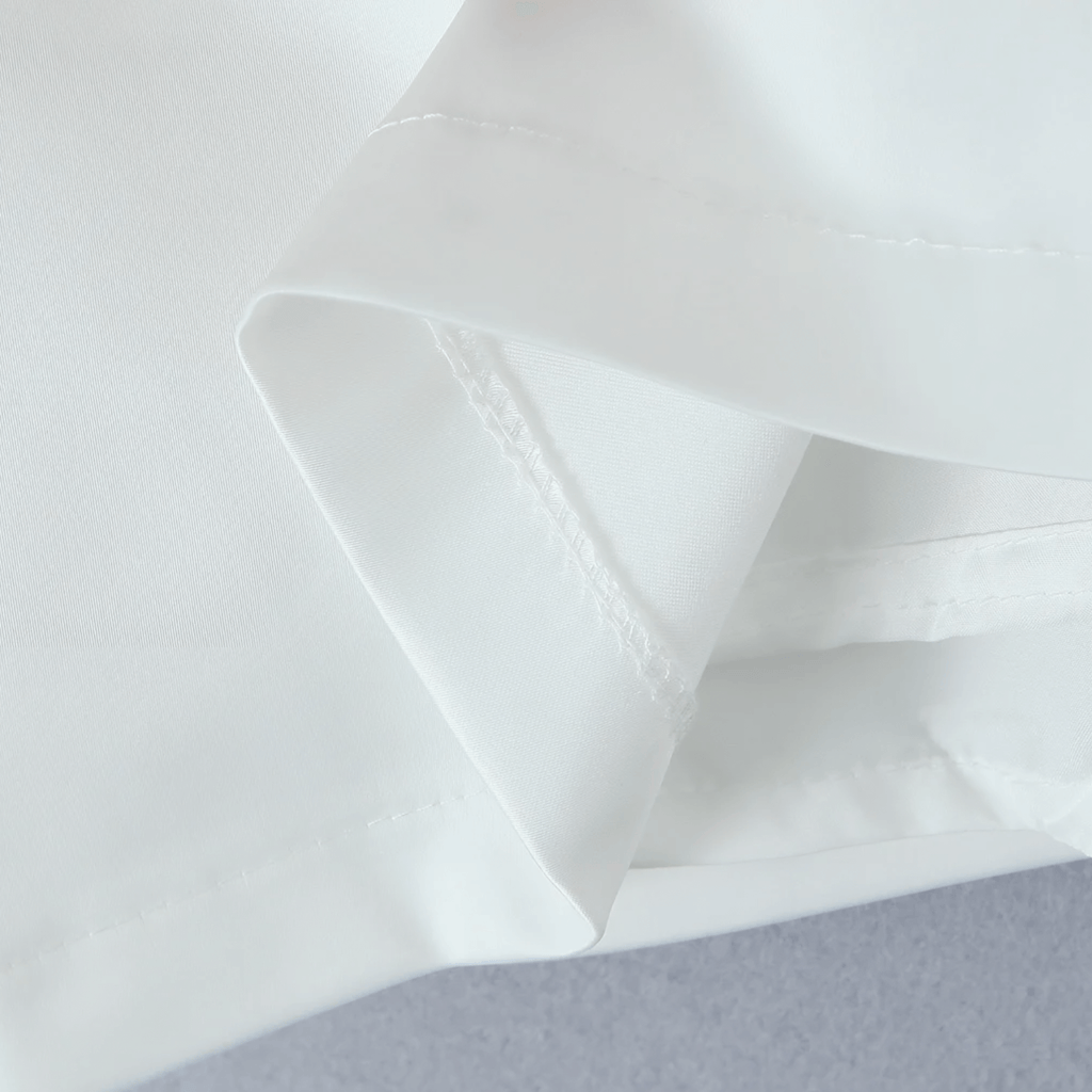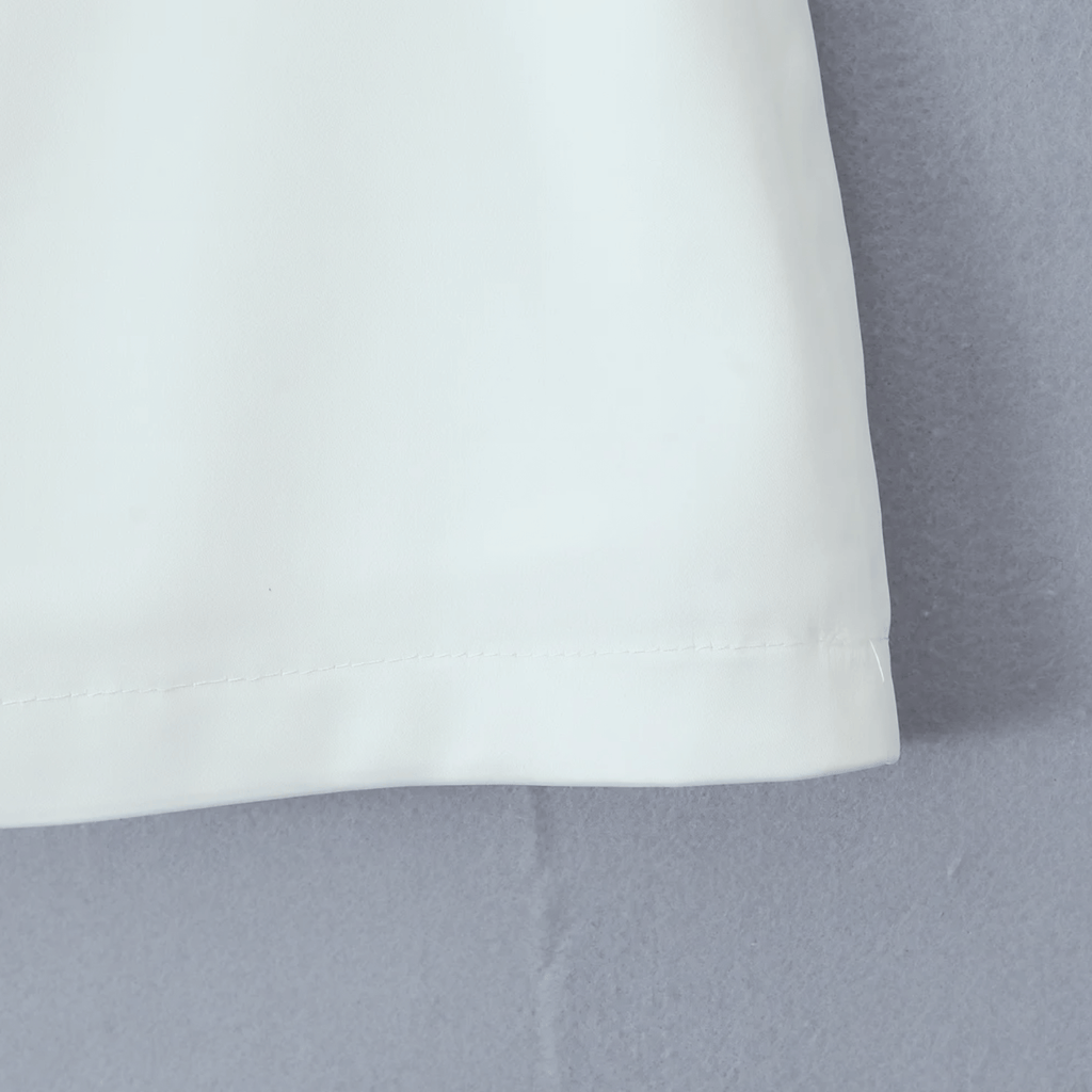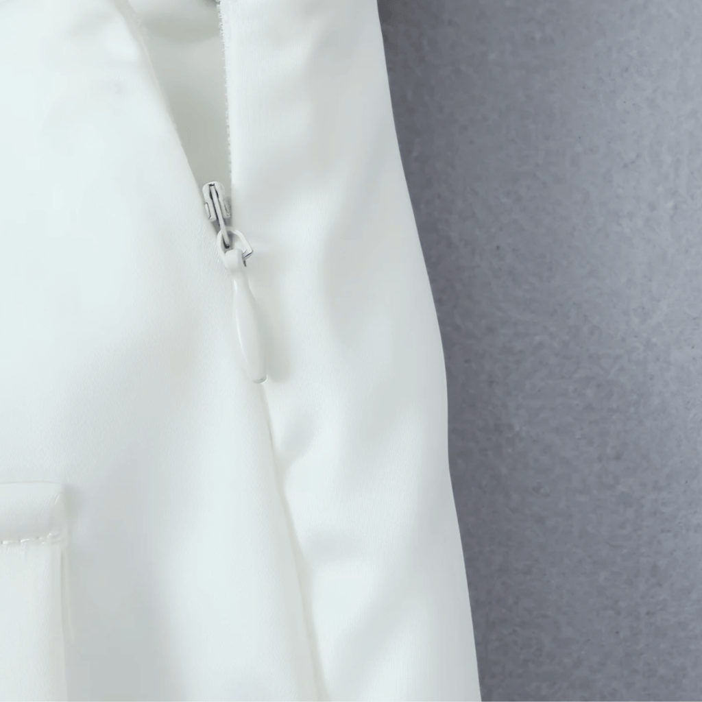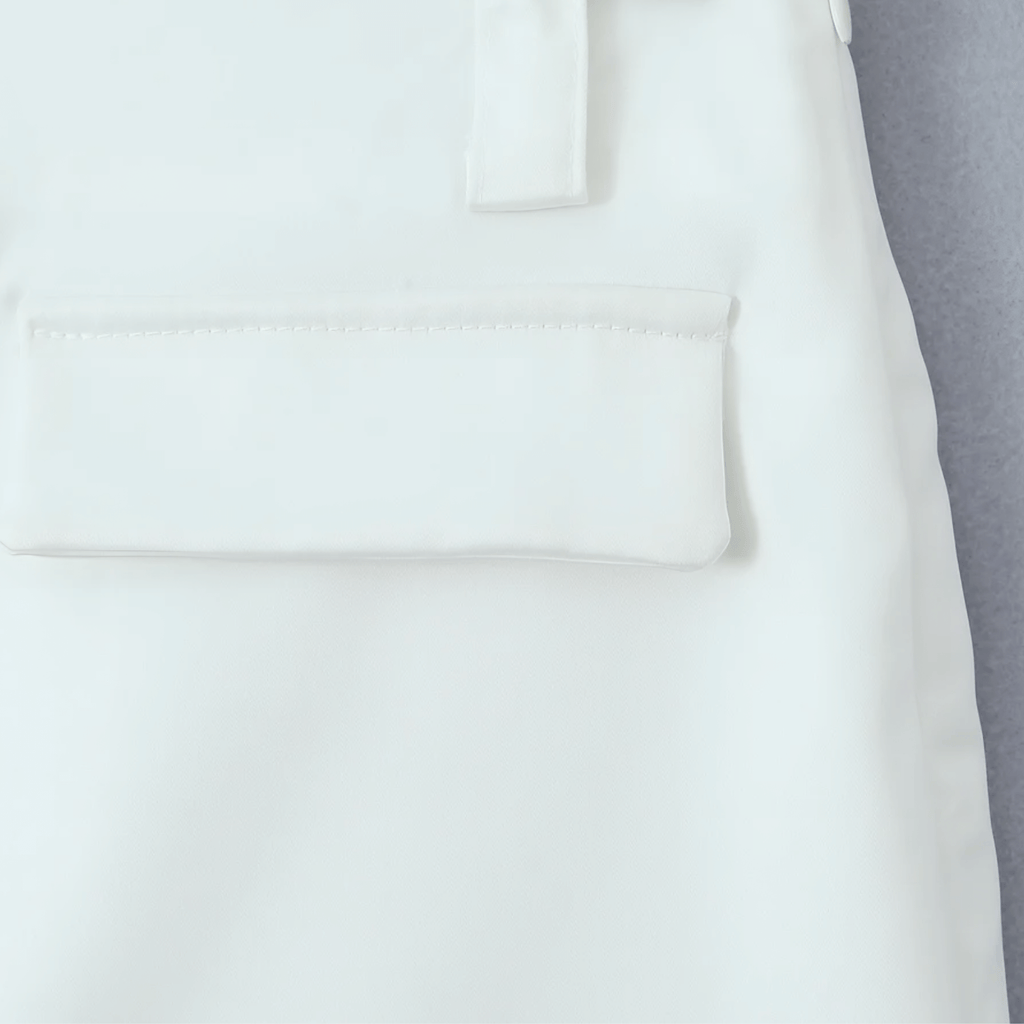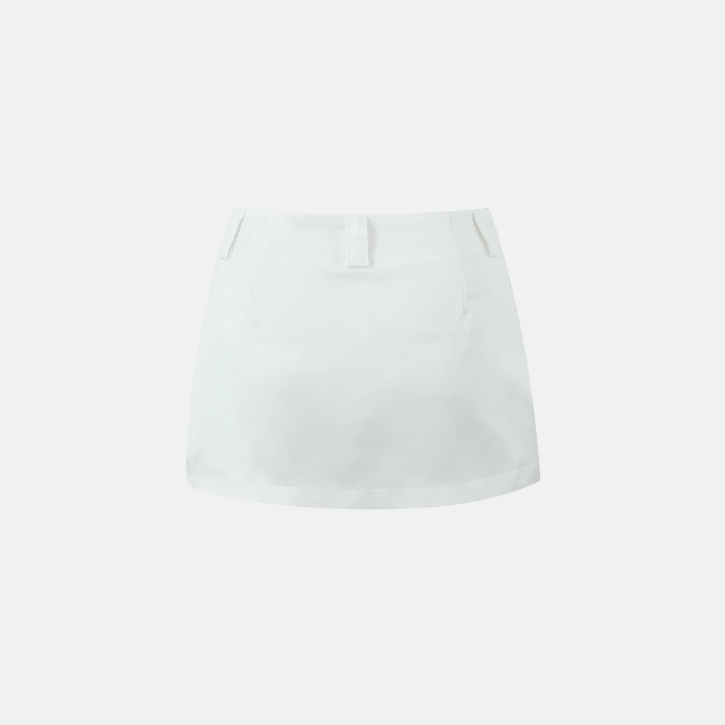 Saia curta de cintura alta com modelagem reta. Bolsos decorativos com aba frontal. Passantes aplicados. Fecho lateral invisível. Tecido estruturado e acabamento refinado.