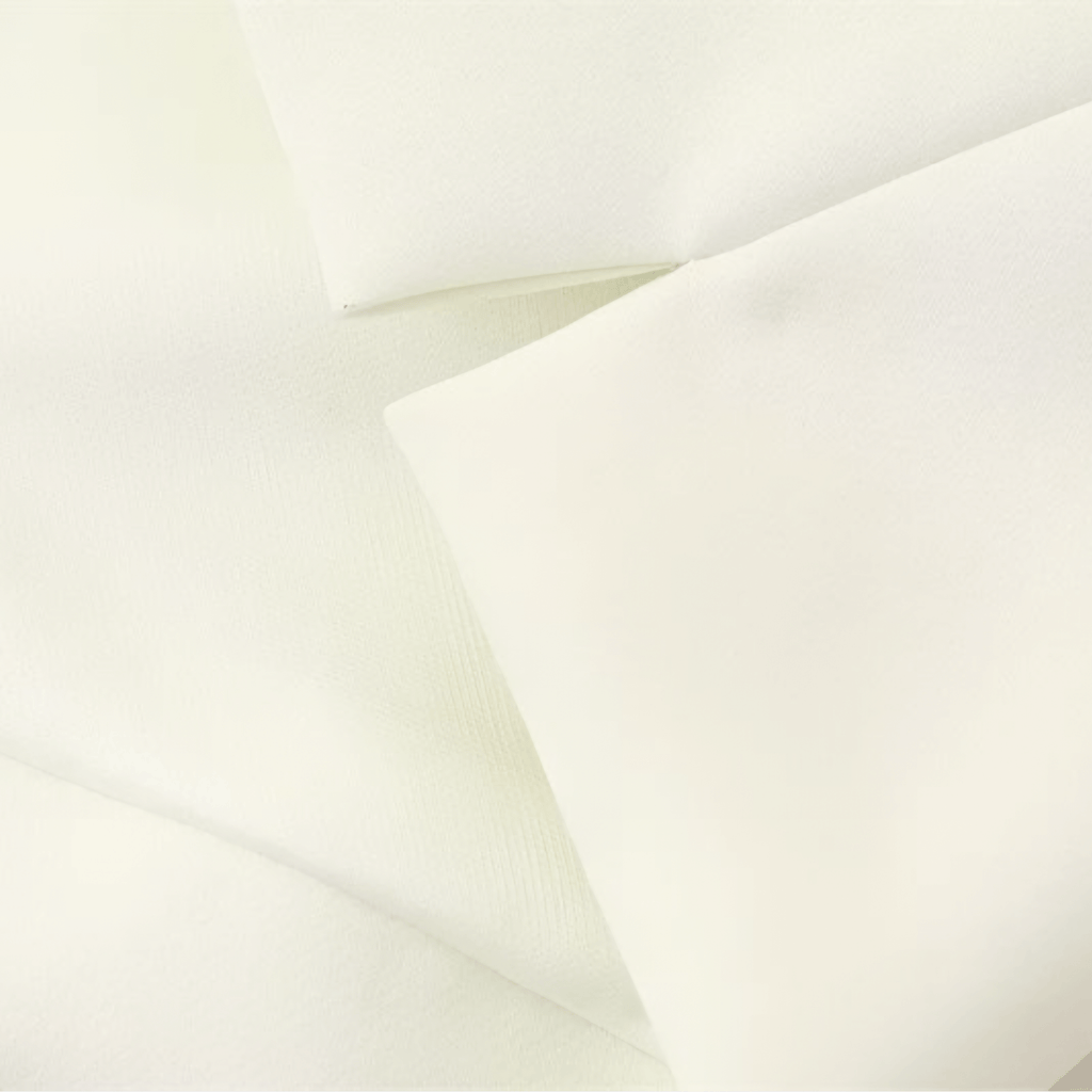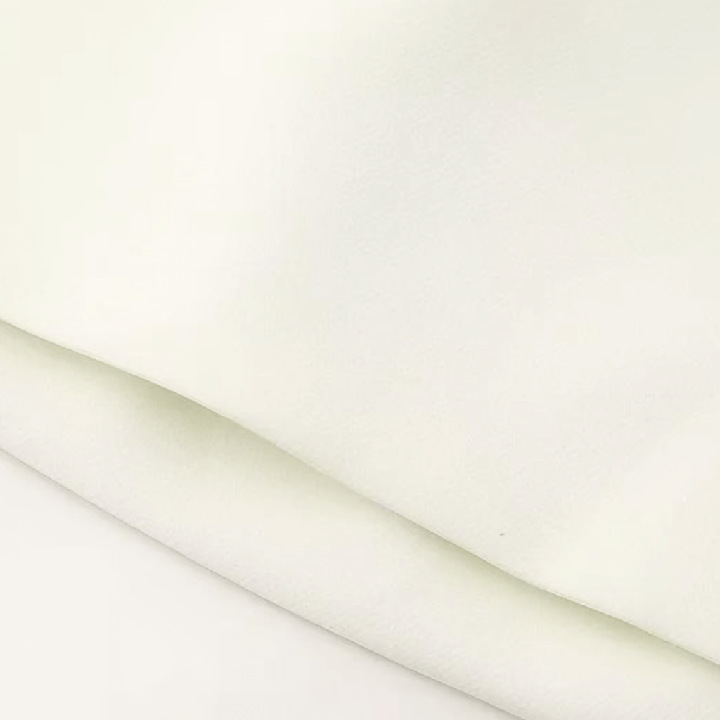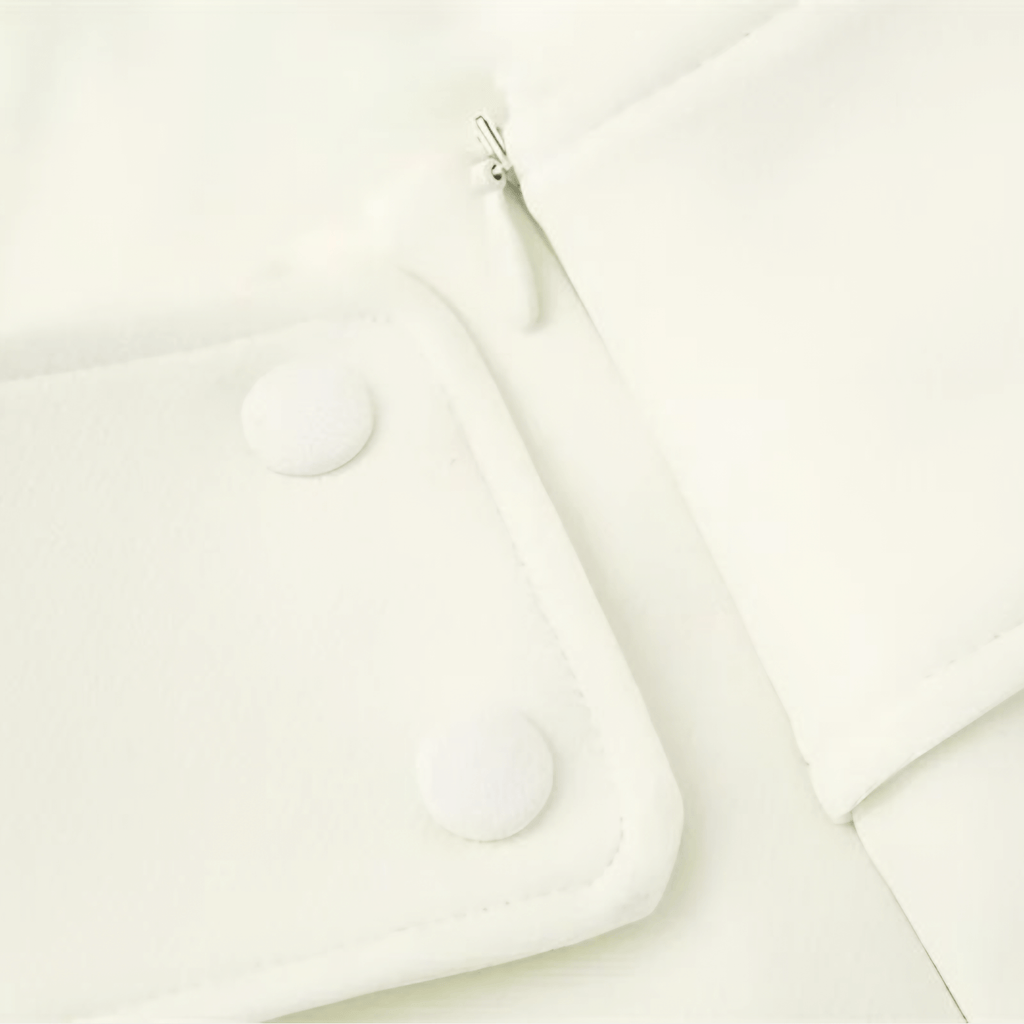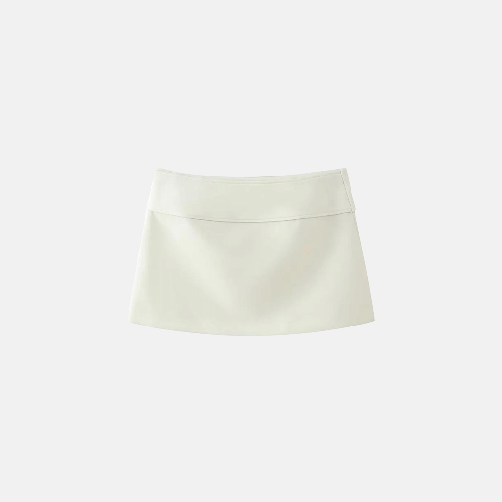 Saia curta de cintura alta com detalhe de sobreposição na parte superior. Fecho lateral em zíper oculto e botões decorativos na frente. Acabamento liso e minimalista.