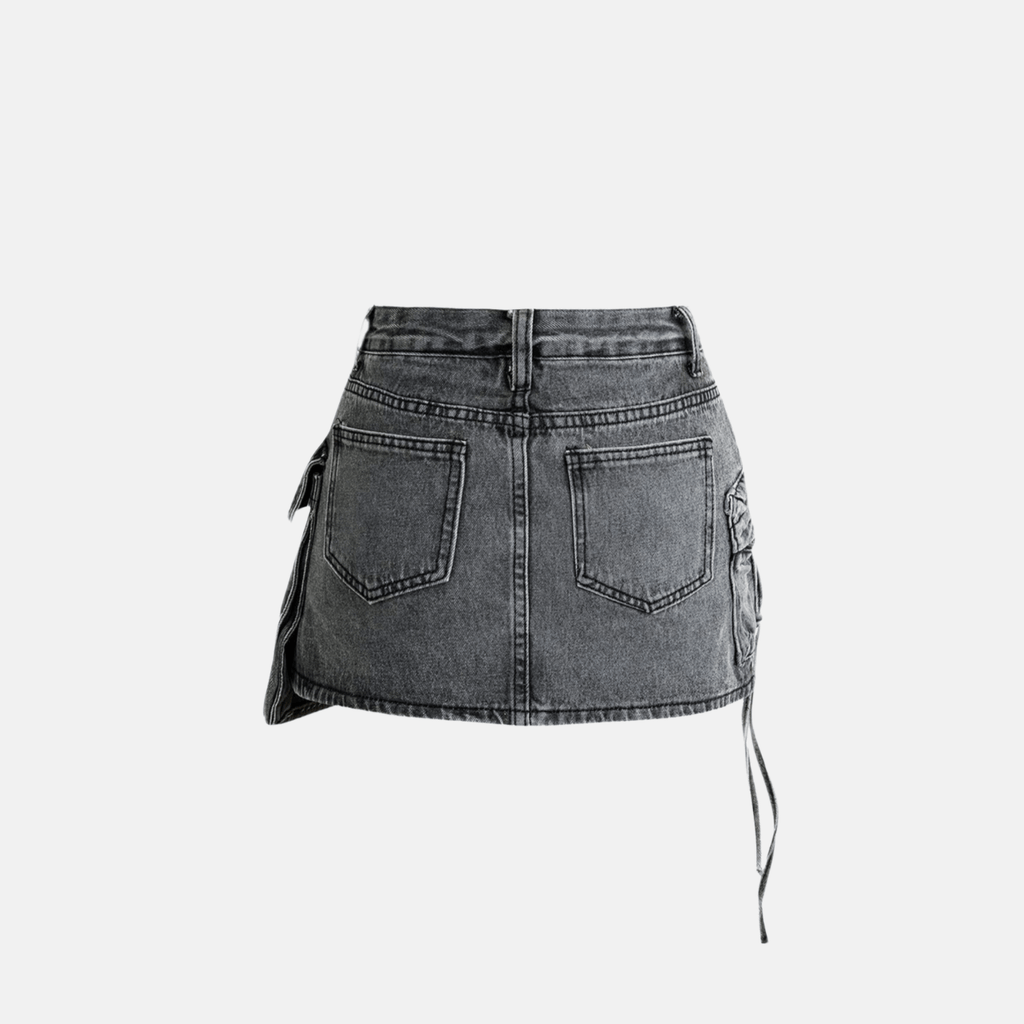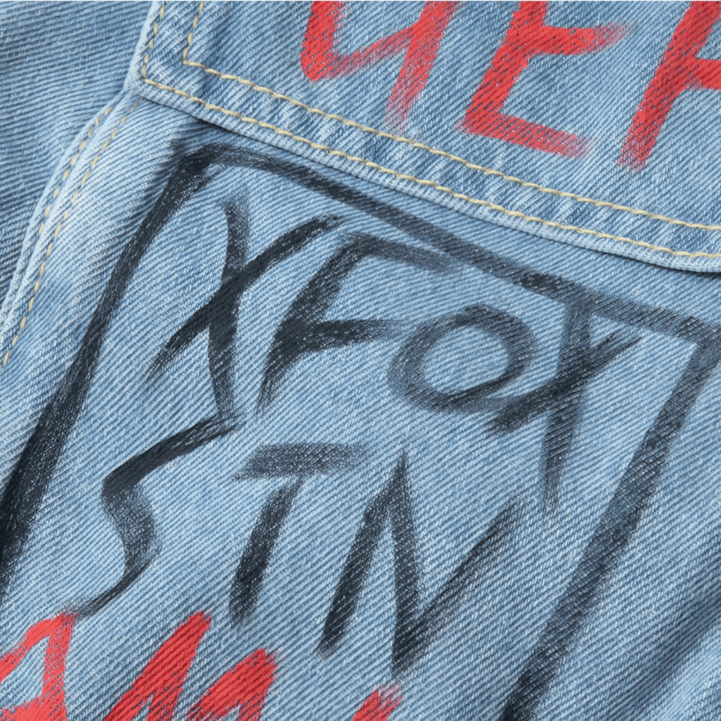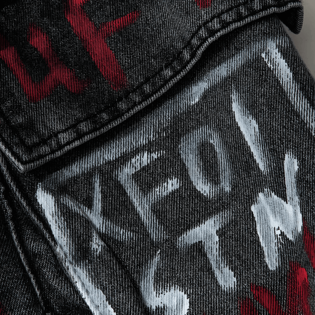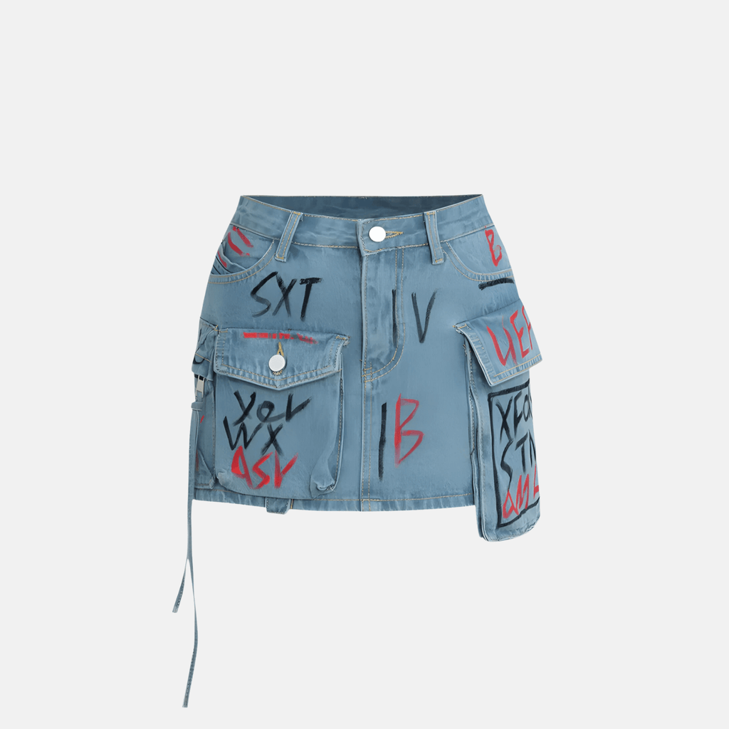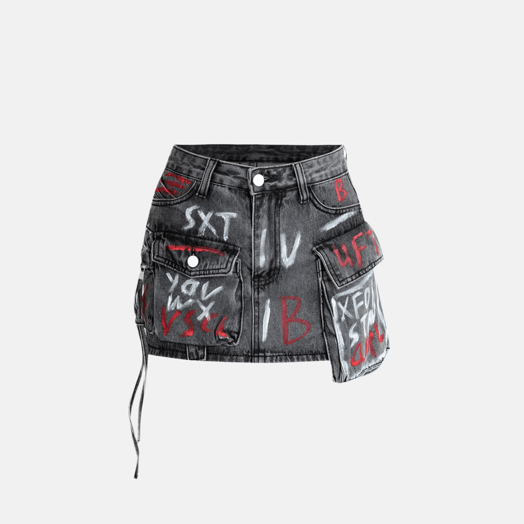 Saia curta de cintura alta com estampa grafitada. Possui bolsos utilitários frontais e fecho frontal com zíper e botão metálico. Detalhes decorativos em vermelho e branco.