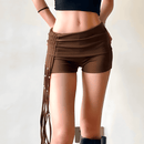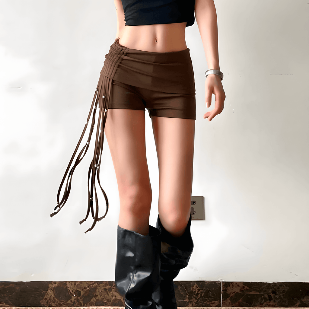 Short de cintura alta com sobreposição lateral drapeada. Amarração trançada com franjas longas e detalhes metálicos. Tecido maleável e ajustável ao corpo. Acabamento macio.