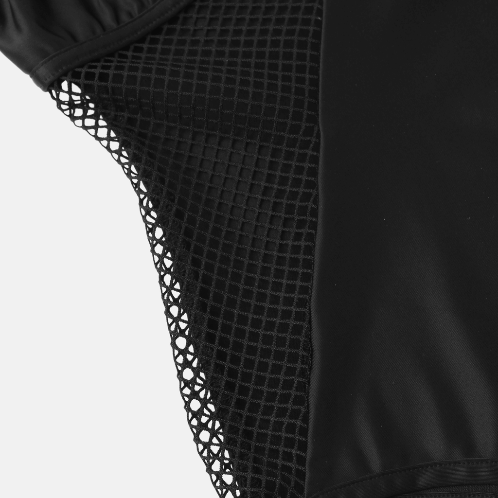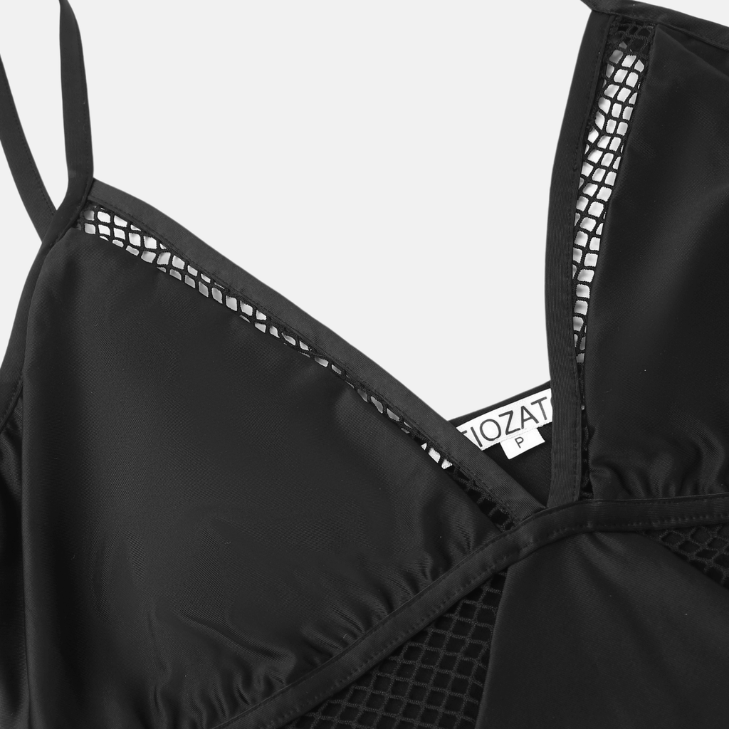 Body com alças finas ajustáveis e decote em V com detalhes em tela. Laterais com textura de tela para contraste. Fecho inferior com botões de pressão.
