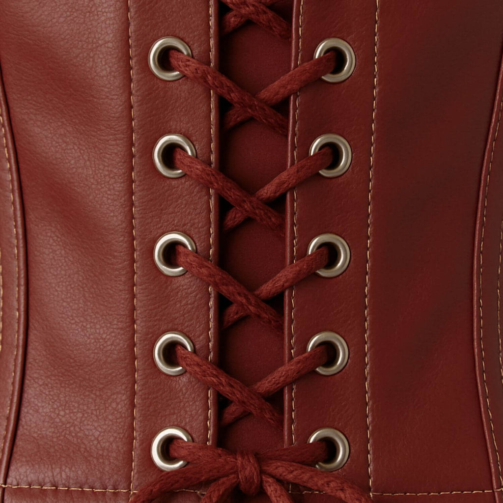 Top tomara-que-caia com estrutura corset. Recortes com costuras aparentes e barbatanas embutidas. Fecho posterior por amarração com ilhós metálicos.