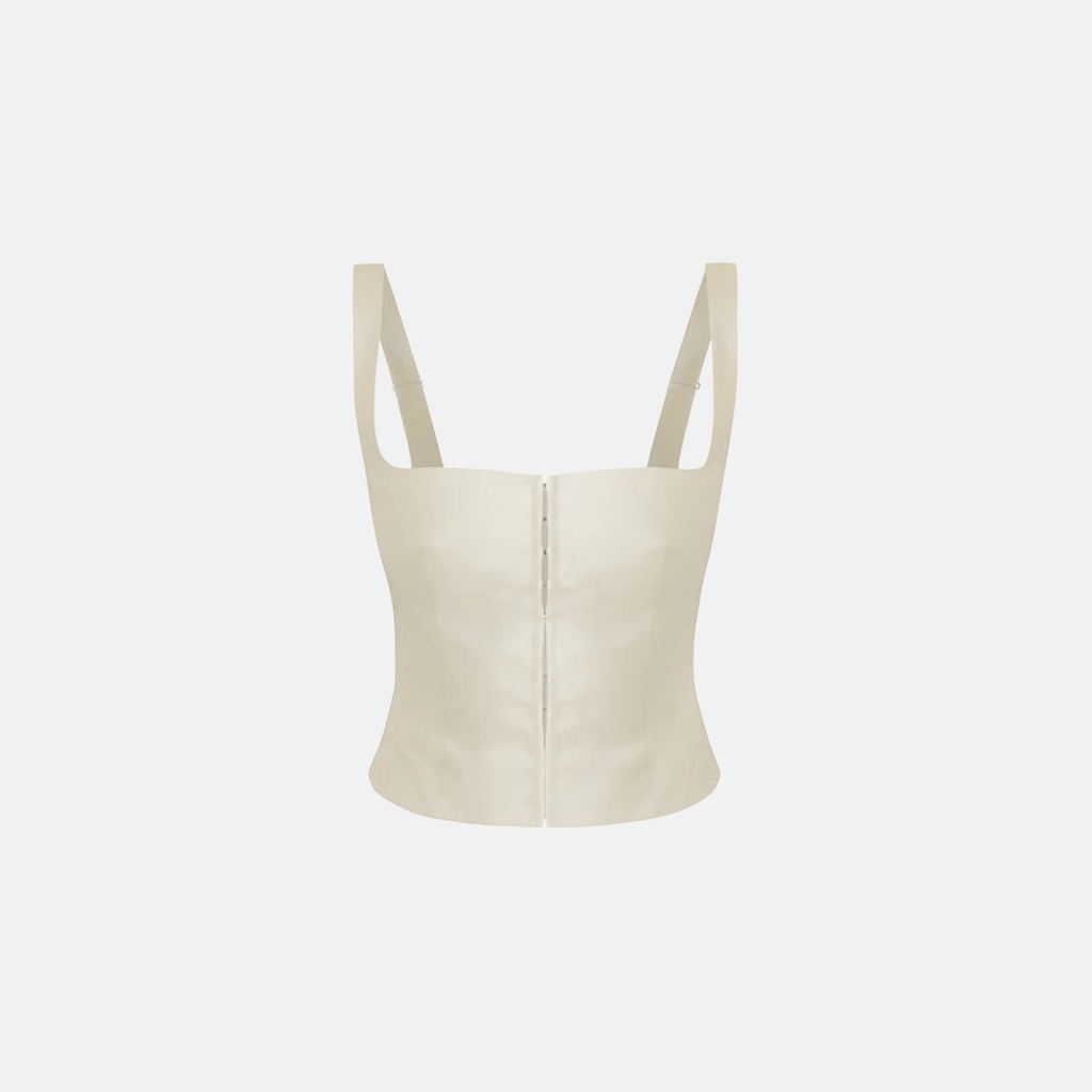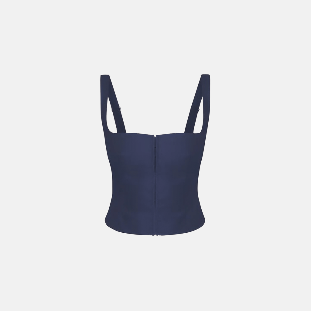 Top de alças largas e decote quadrado. Fecho frontal com zíper oculto. Ajuste ao corpo, comprimento na altura da cintura.