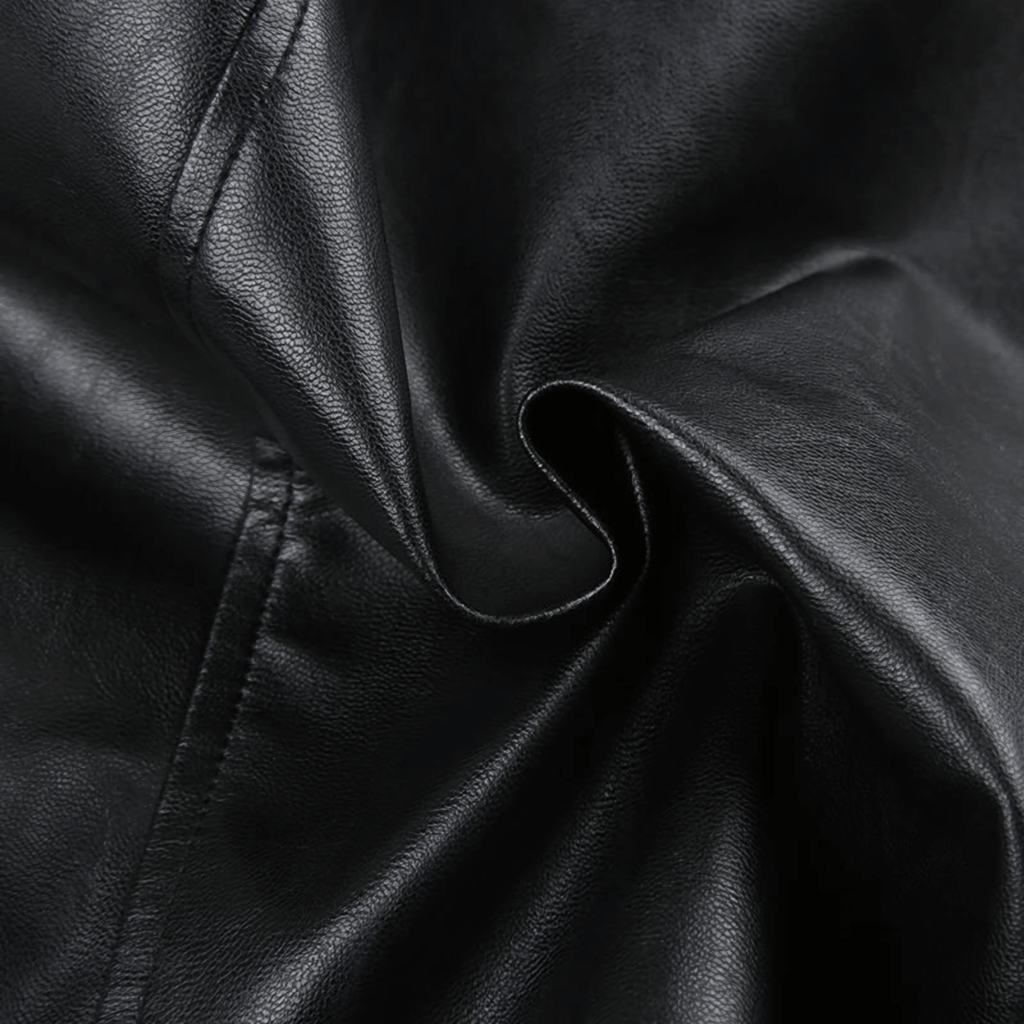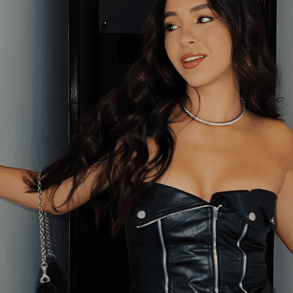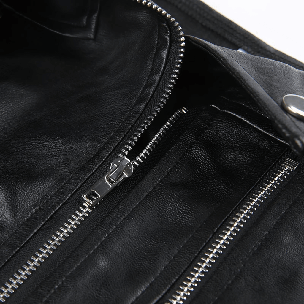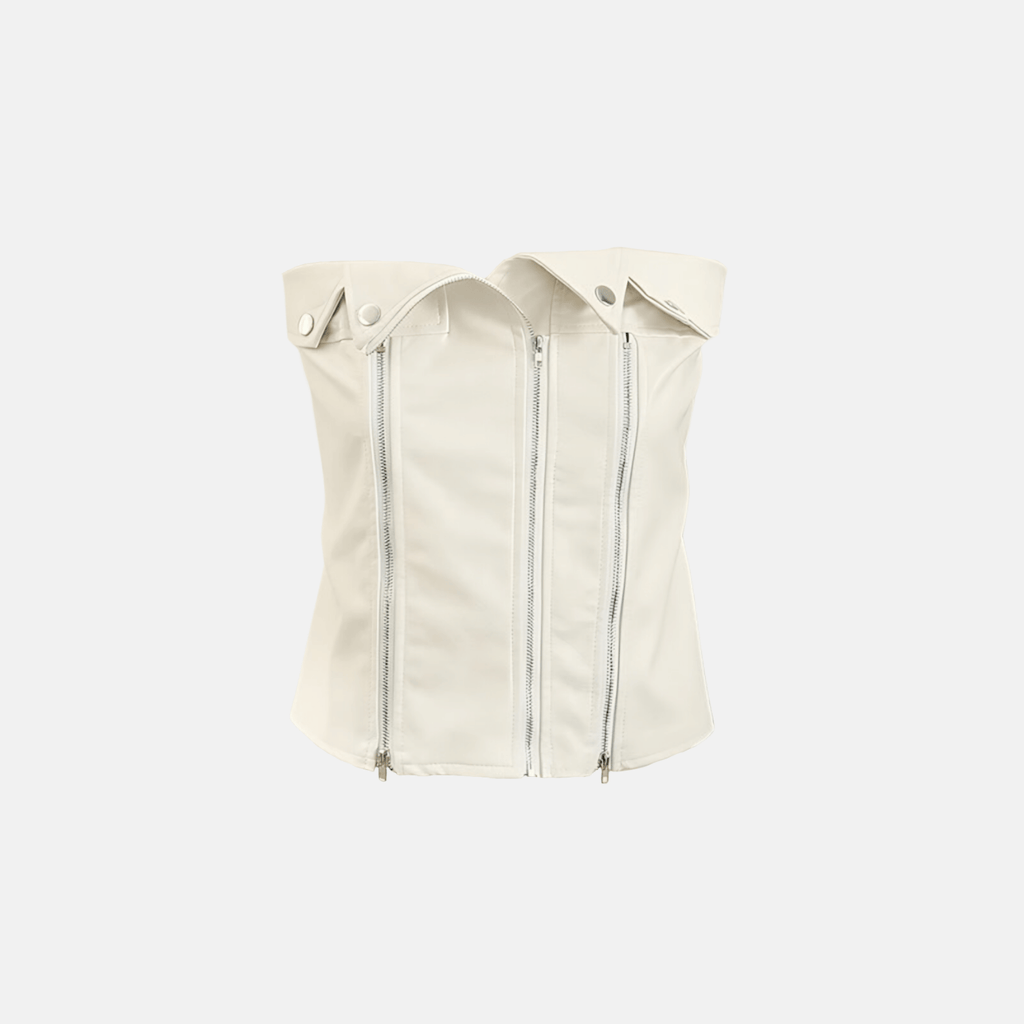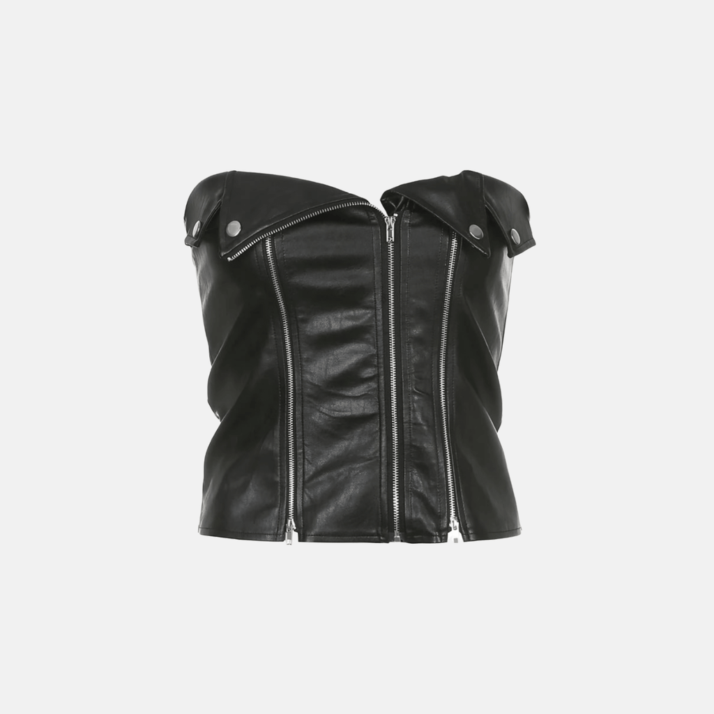 Top de couro sintético sem alças, com zíper frontal duplo decorativo e detalhes metálicos. Corte ajustável ao corpo, com acabamento em costuras reforçadas.