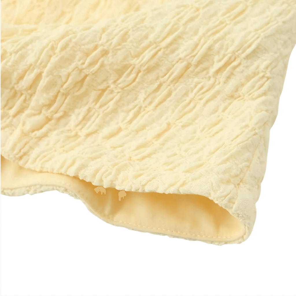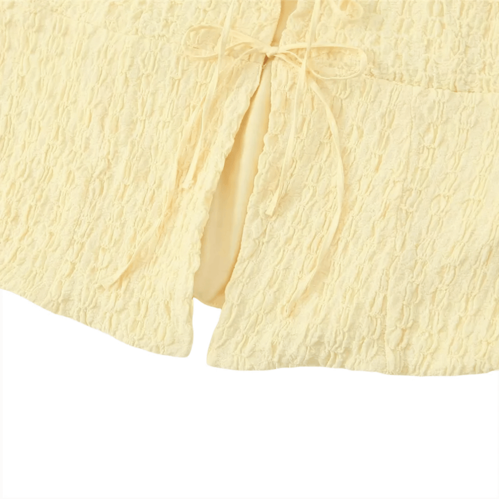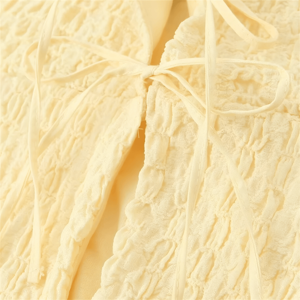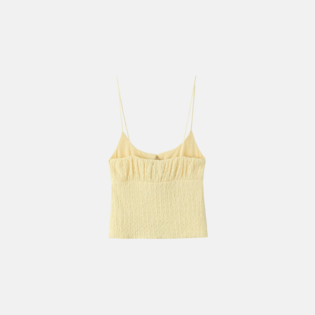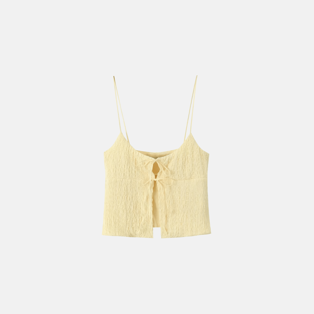 Top de alças finas com textura enrugada e acabamento suave. Decote reto com amarração frontal. Caimento solto e levemente estruturado nas costas.