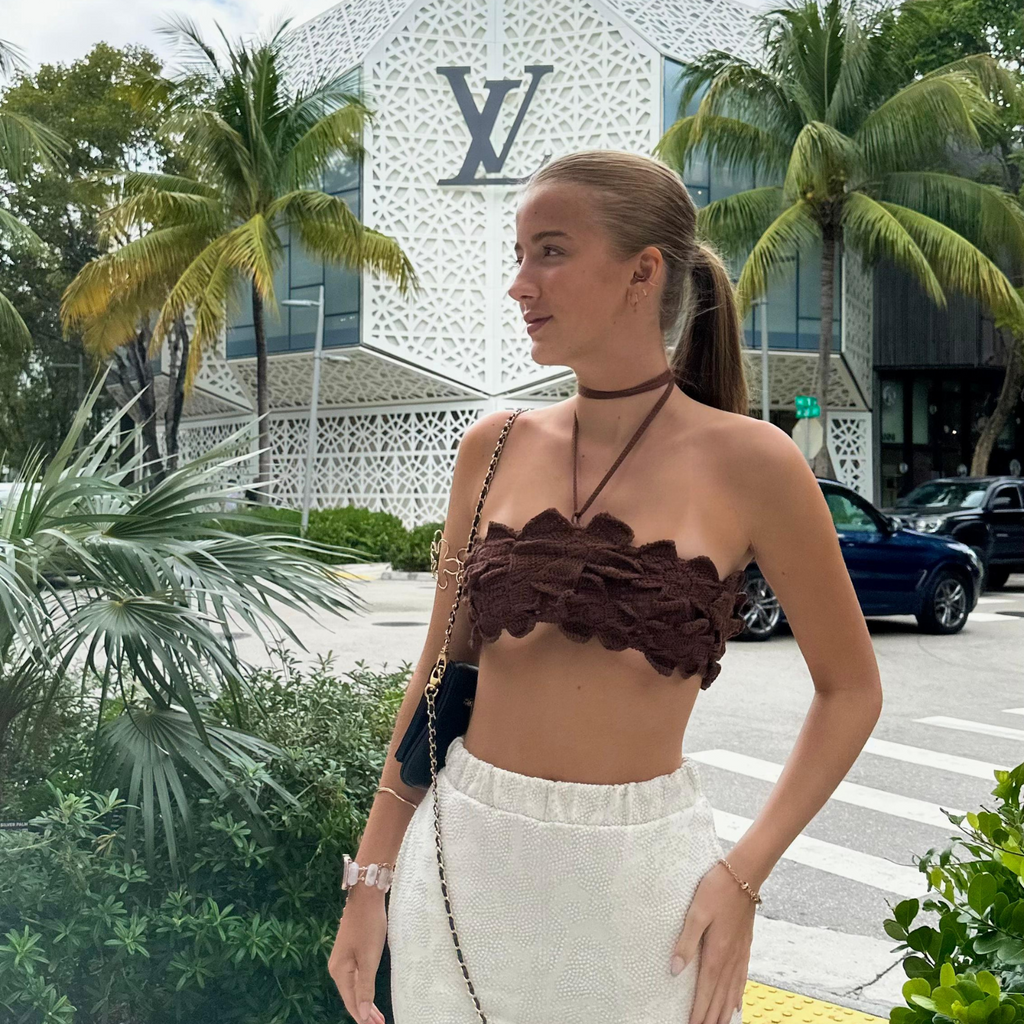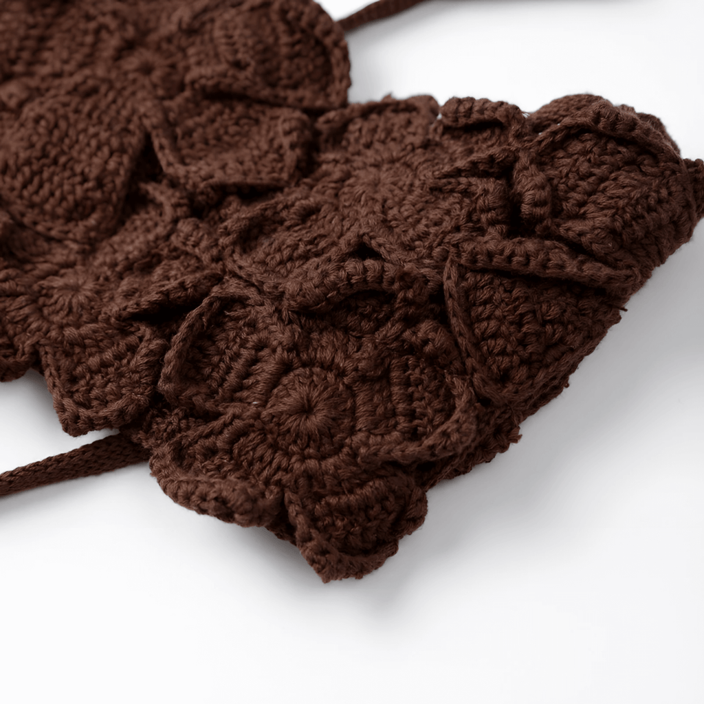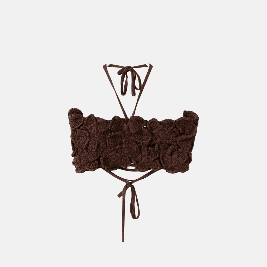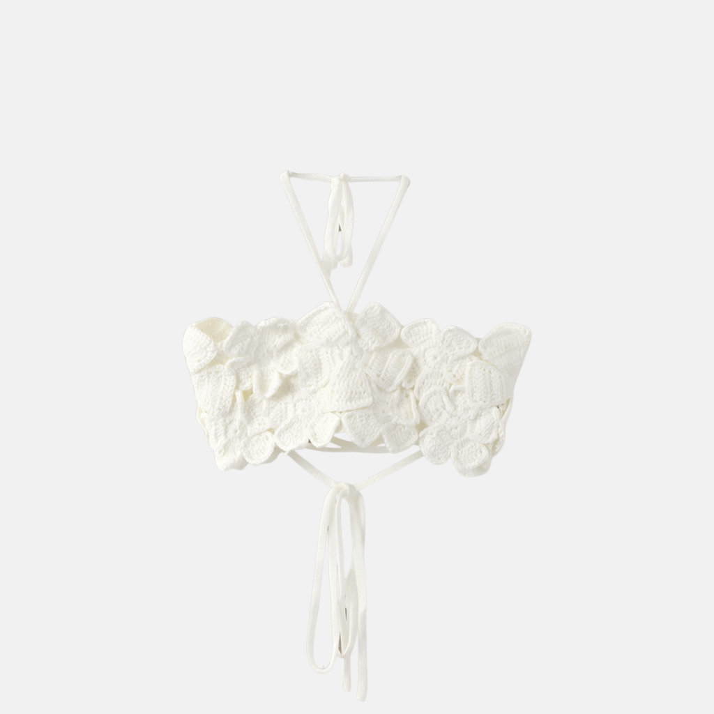 Top de crochê com detalhes florais aplicados. Ajuste de amarração nas costas e no pescoço. Design sem alças com textura leve e delicada.