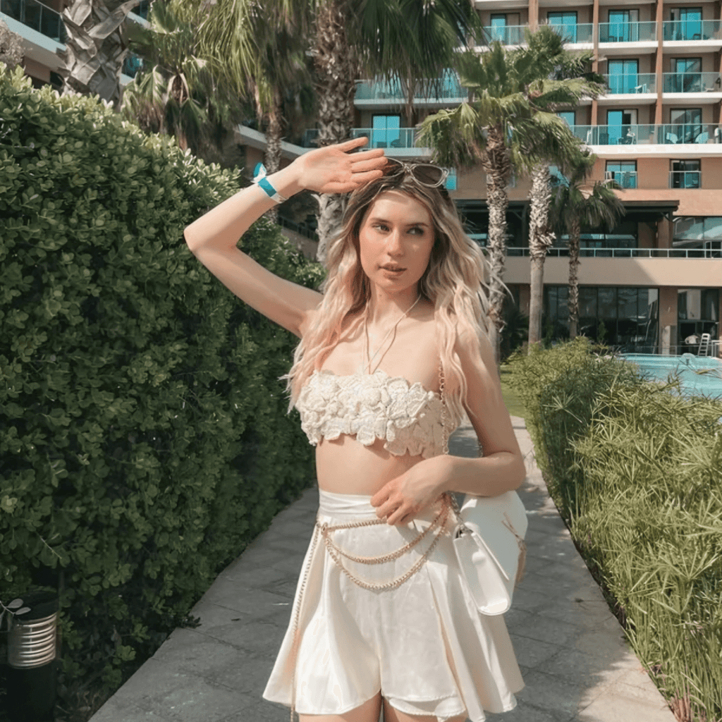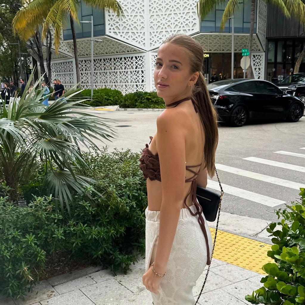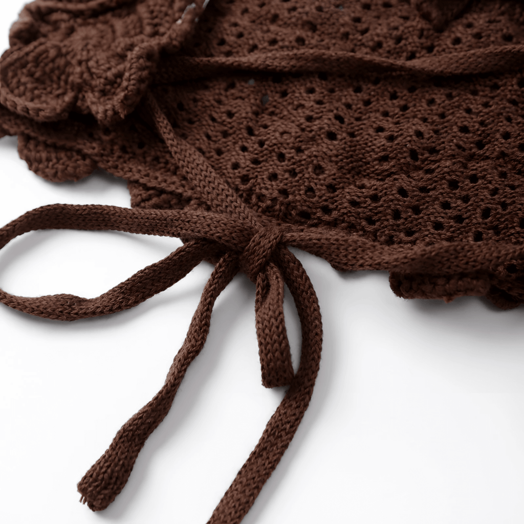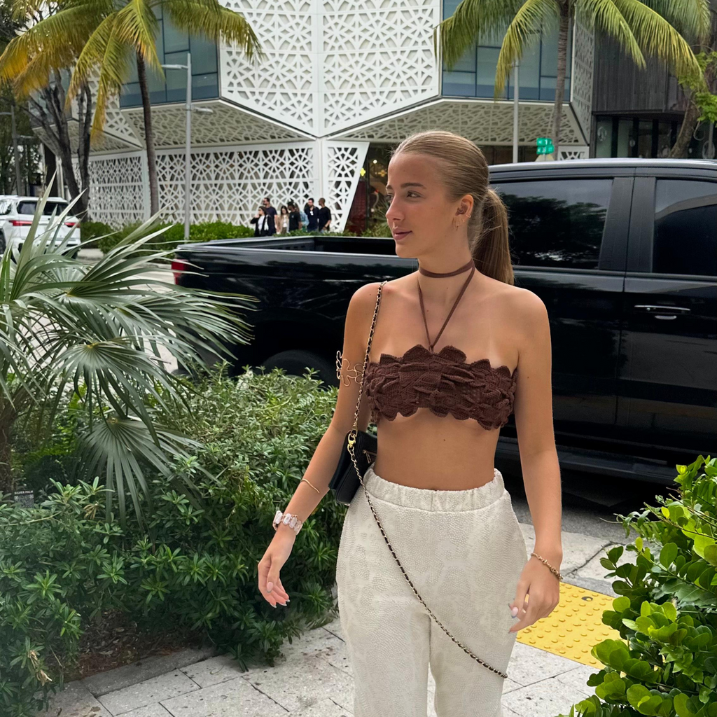 Top de crochê com detalhes florais aplicados. Ajuste de amarração nas costas e no pescoço. Design sem alças com textura leve e delicada.