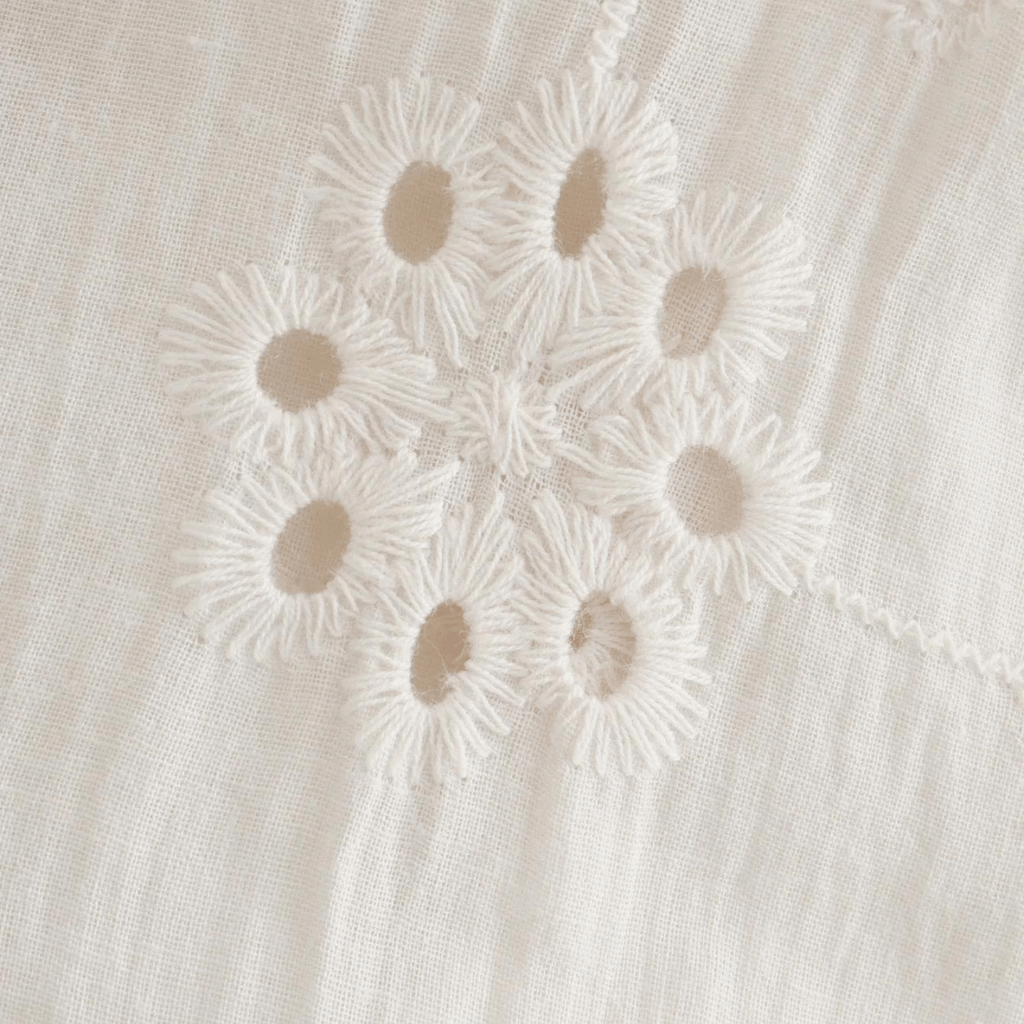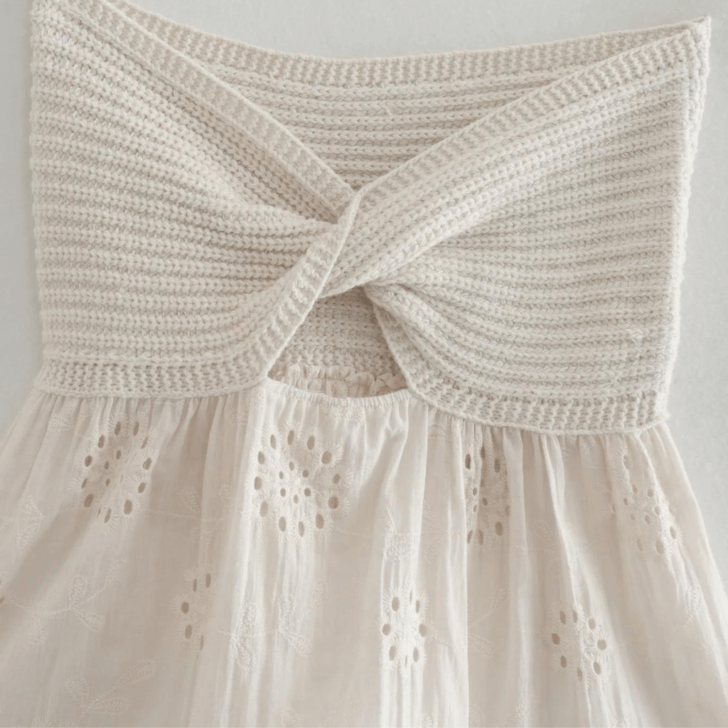 Top sem alças com busto de tricô torcido e saia de tecido bordado. Disponível em branco e preto. Textura leve e delicada.