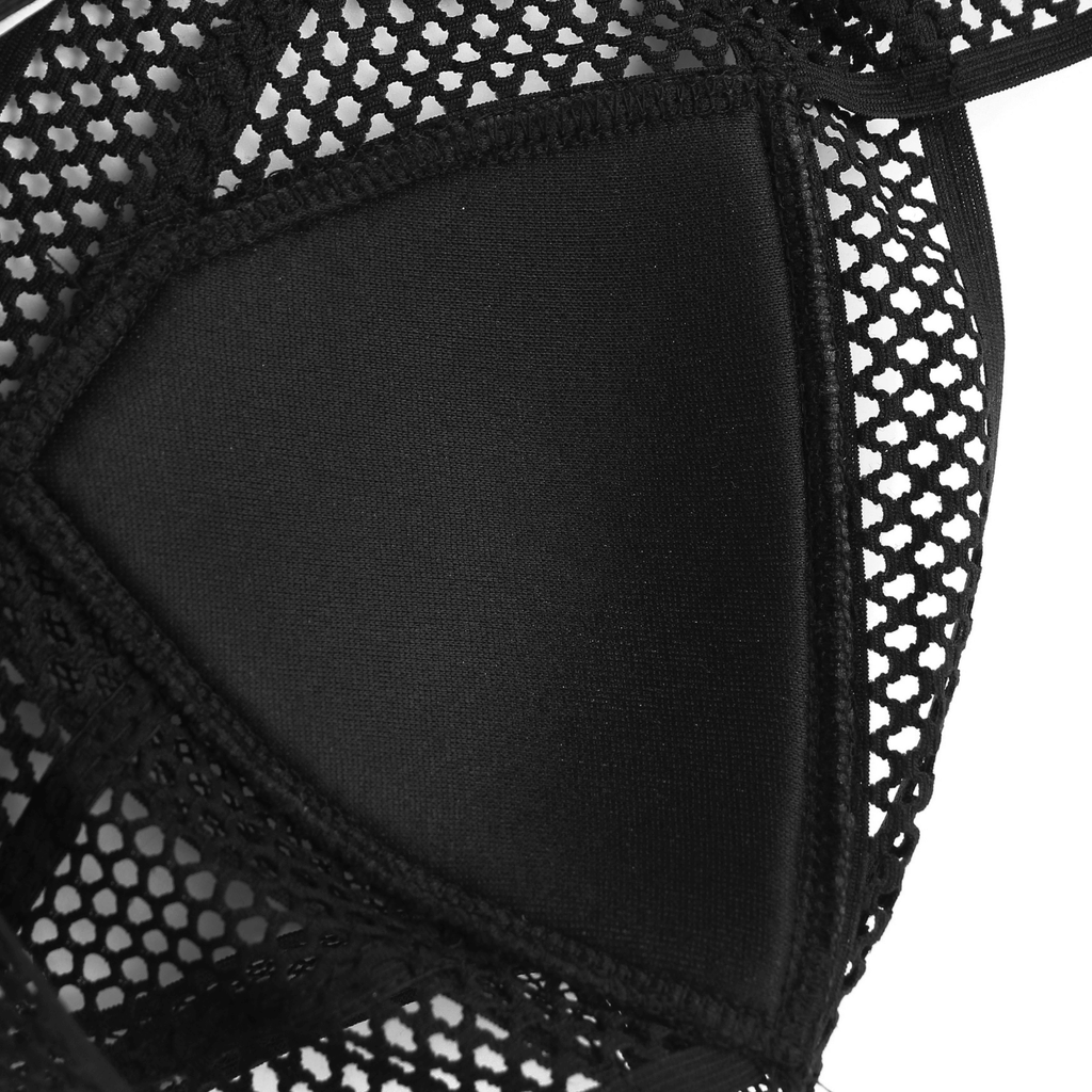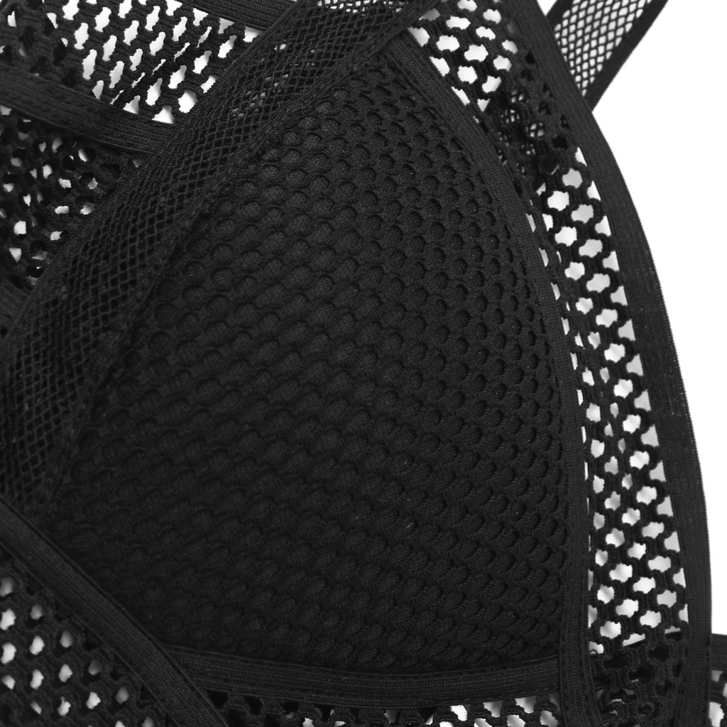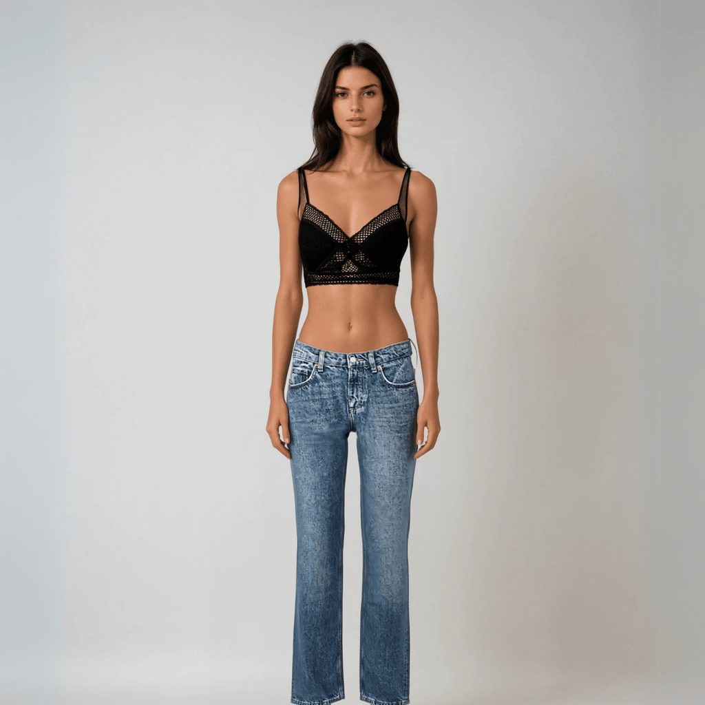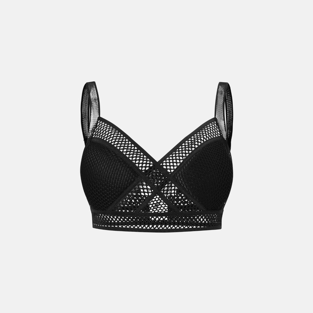 Top com alças médias e acabamento em tela texturizada. Decote em V com sobreposição de tiras cruzadas.