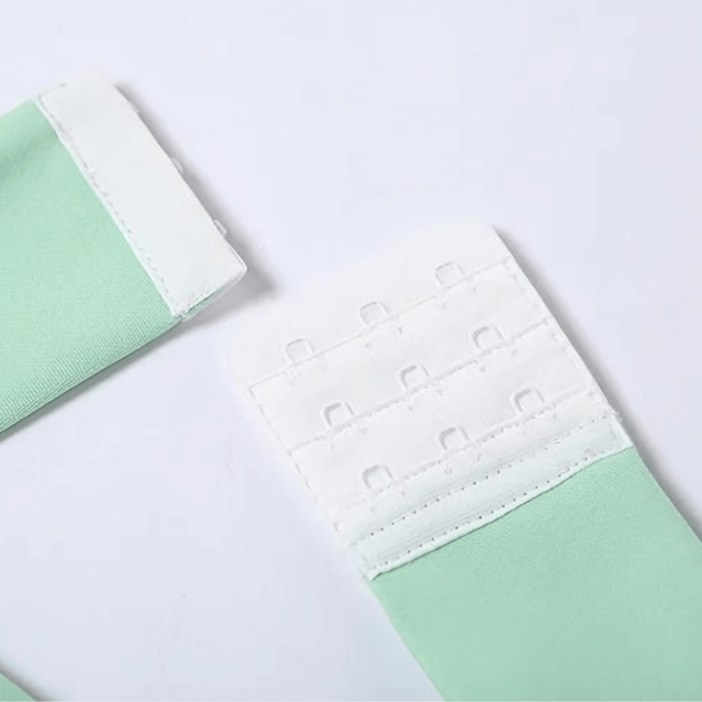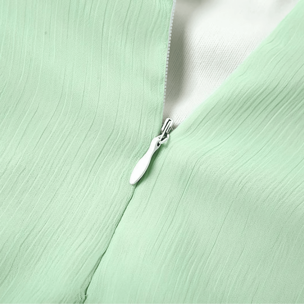 Vestido verde claro com alças largas, busto estruturado e saia rodada com babados. Fecho nas costas. Tecido leve e fluido.