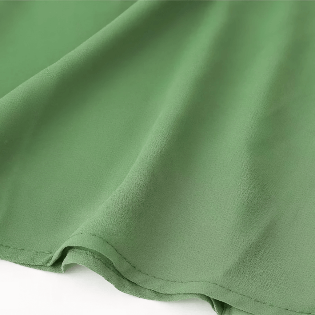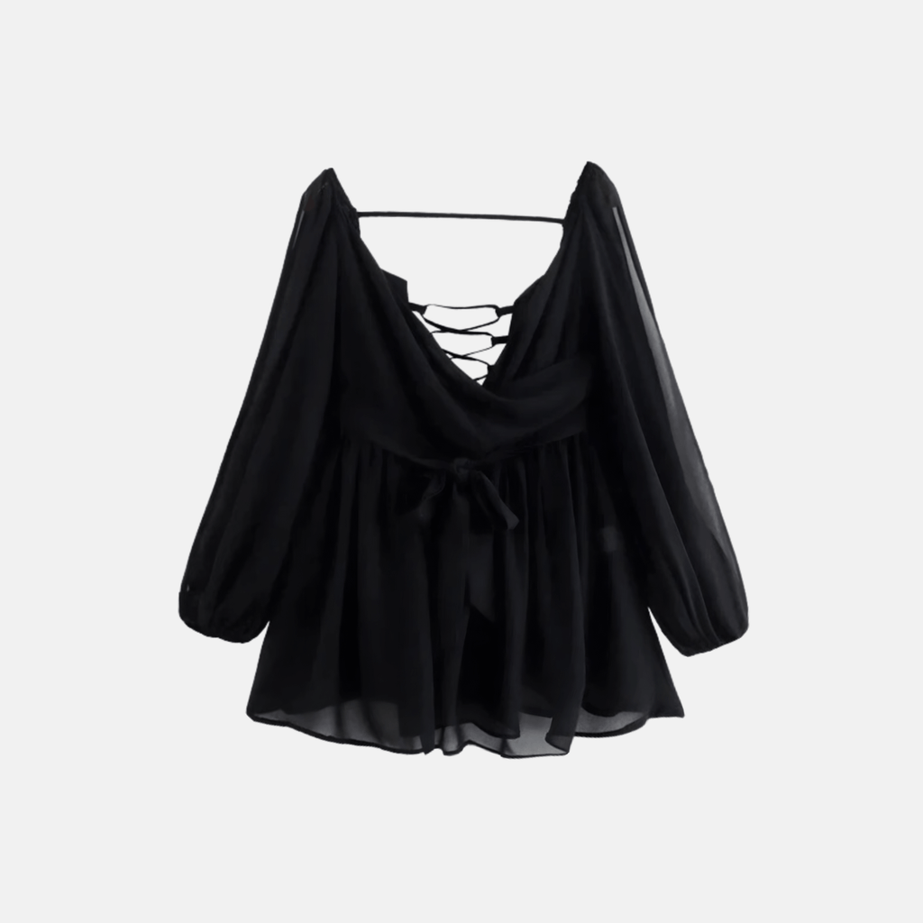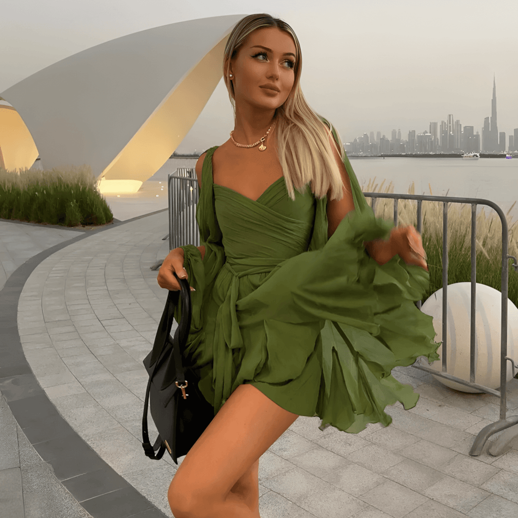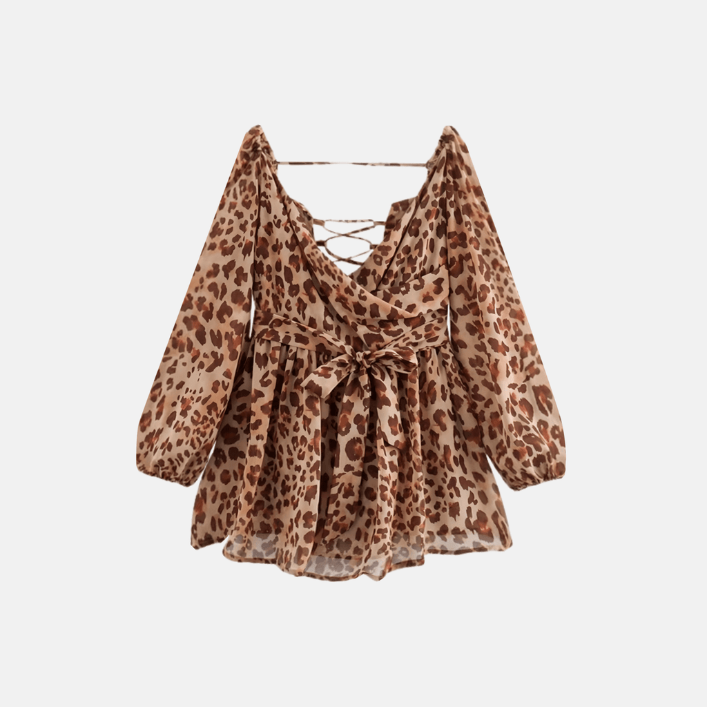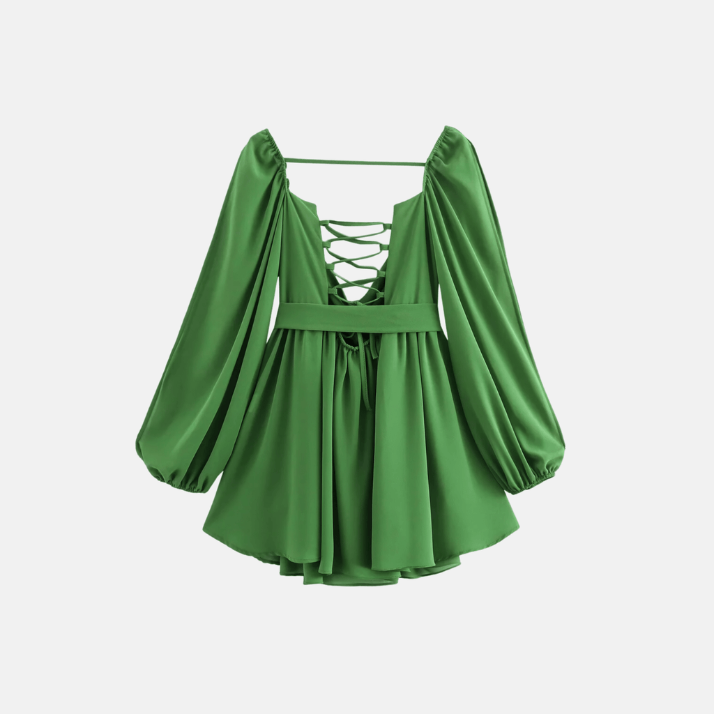 Vestido curto de mangas longas bufantes. Decote cruzado ajustável e saia rodada com amarração na cintura. Detalhe de trançado nas costas.