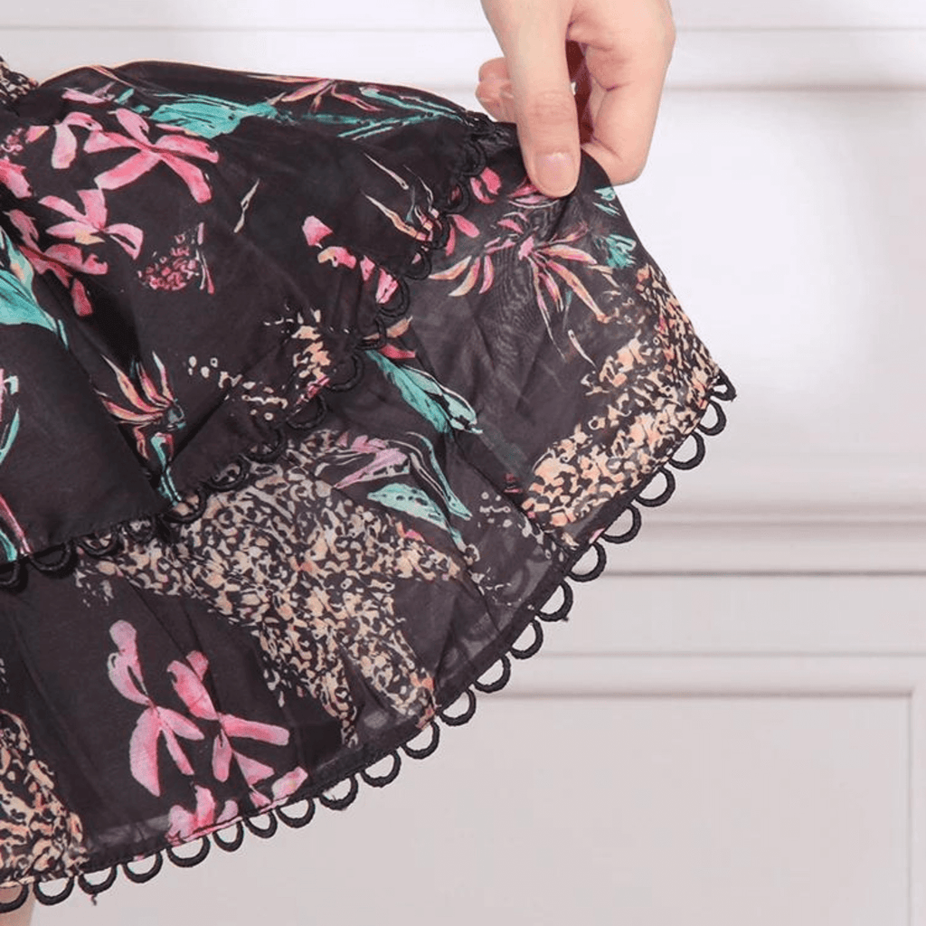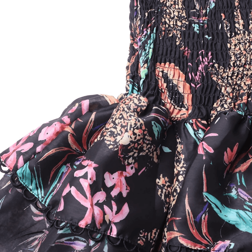 Vestido encantador ajustável ao corpo. sem alças e com decote barrado. comprimento acima dos joelhos com detalhes bordados e estampa única no tecido preto.