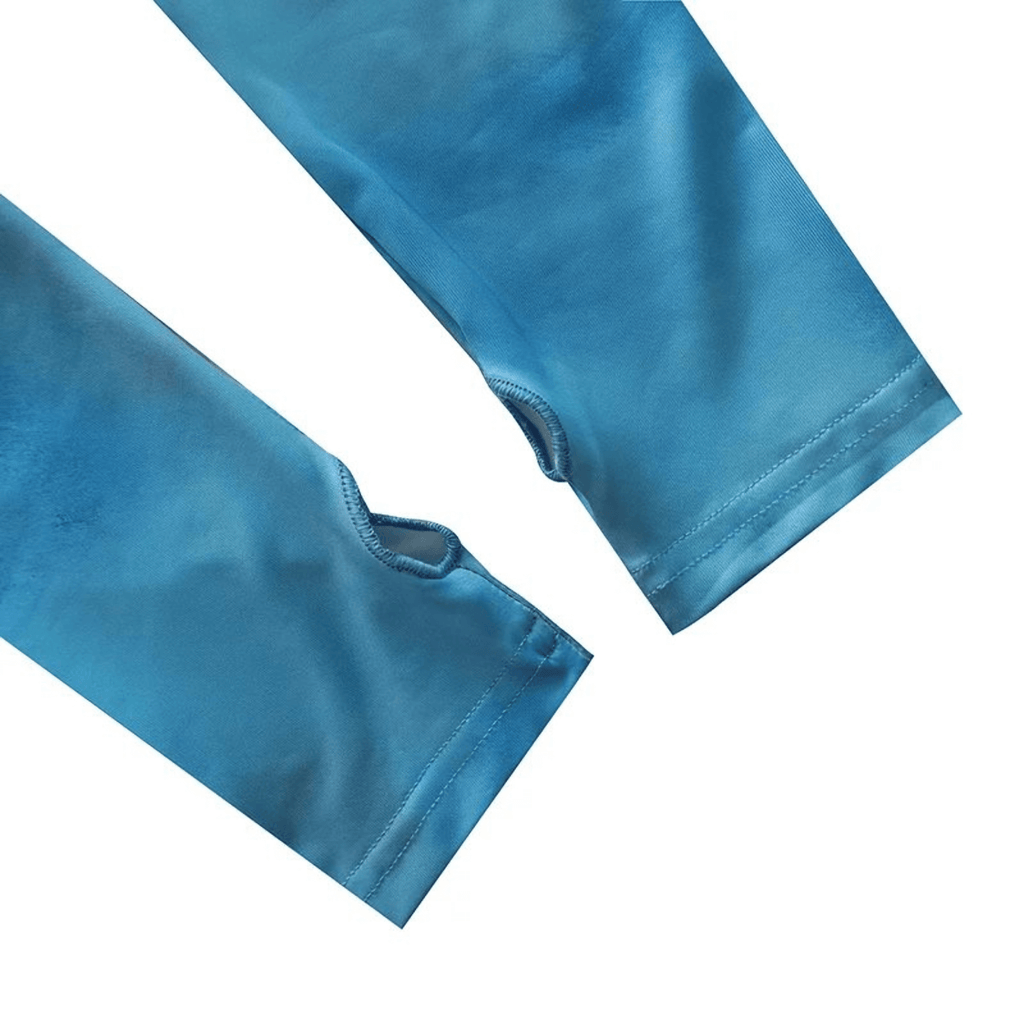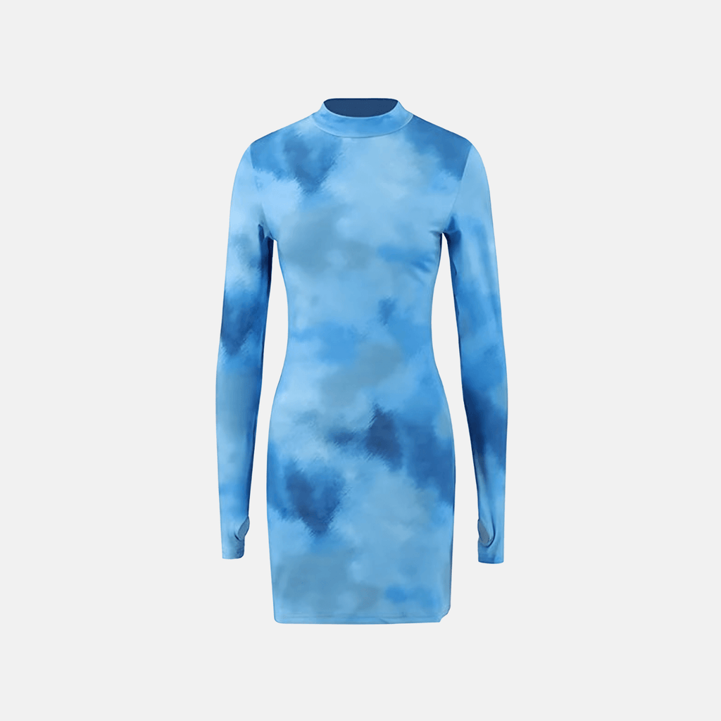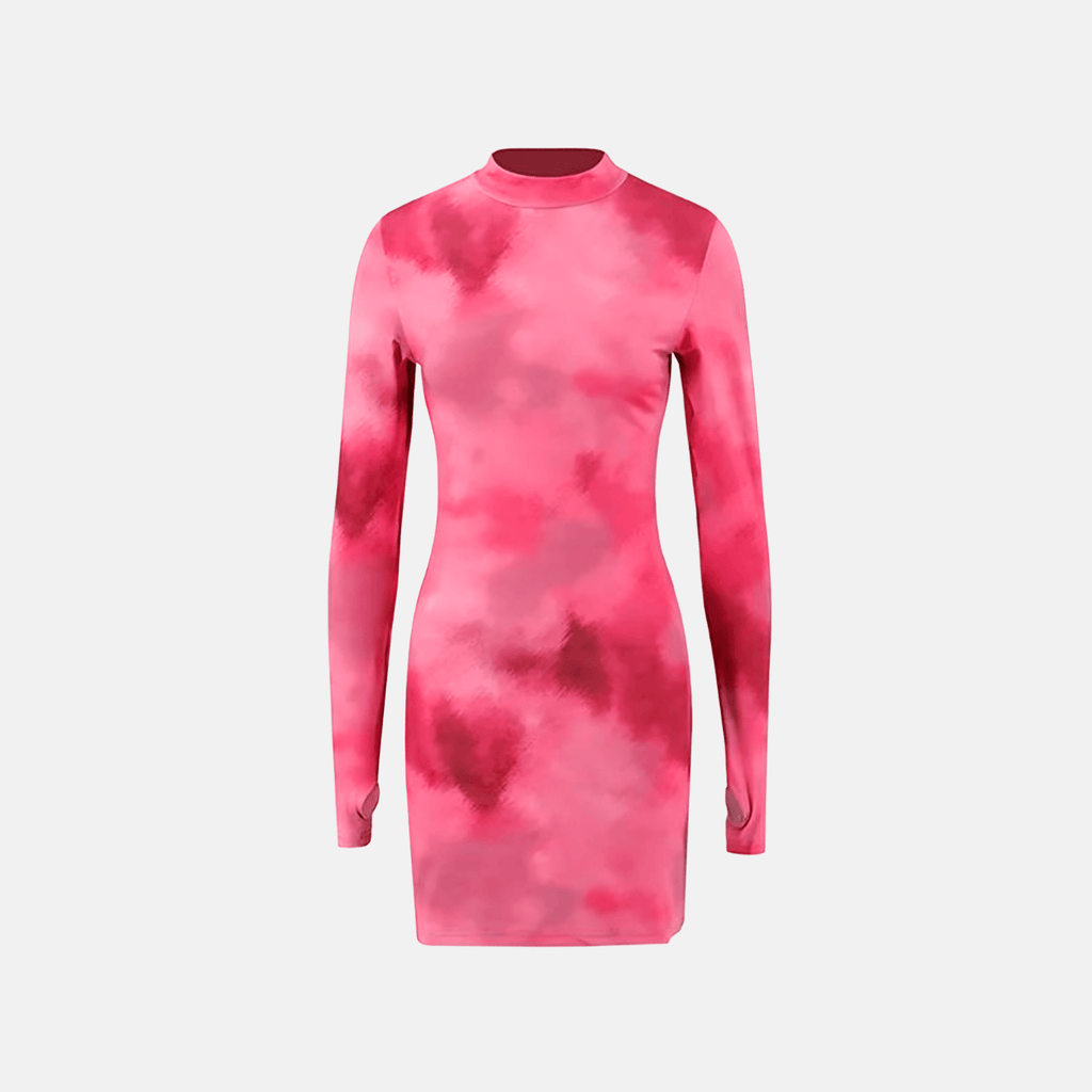 Vestido de manga longa com estampa tie-dye. Ajuste justo ao corpo, com gola alta e recorte nas mangas. Comprimento curto acima dos joelhos.