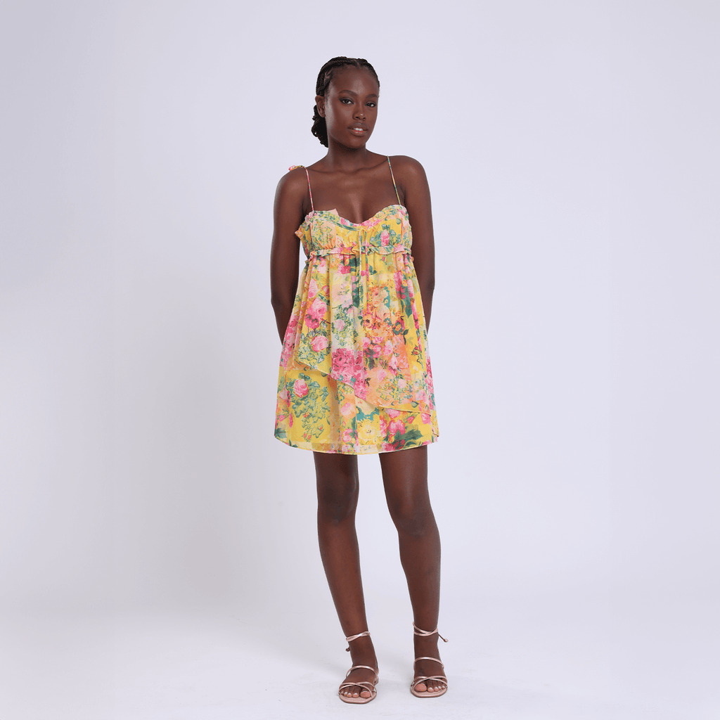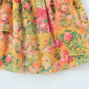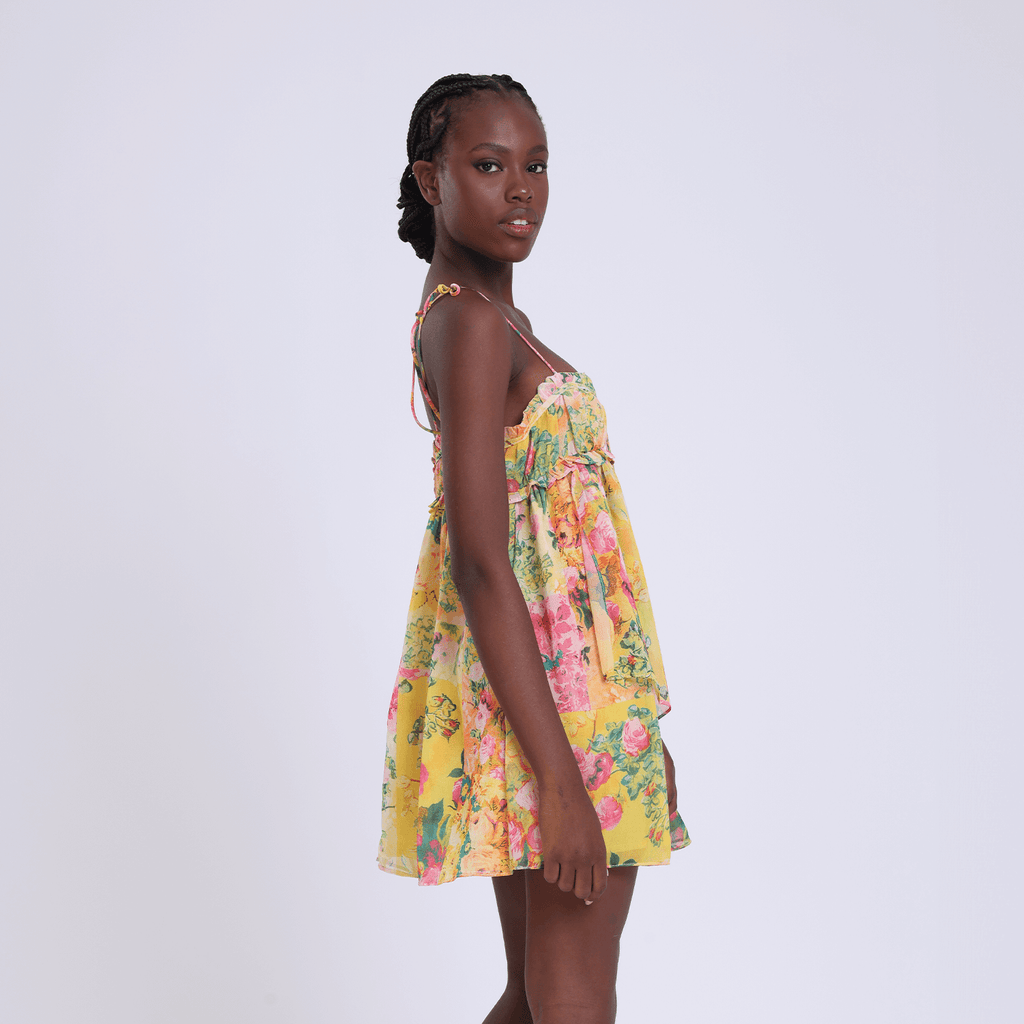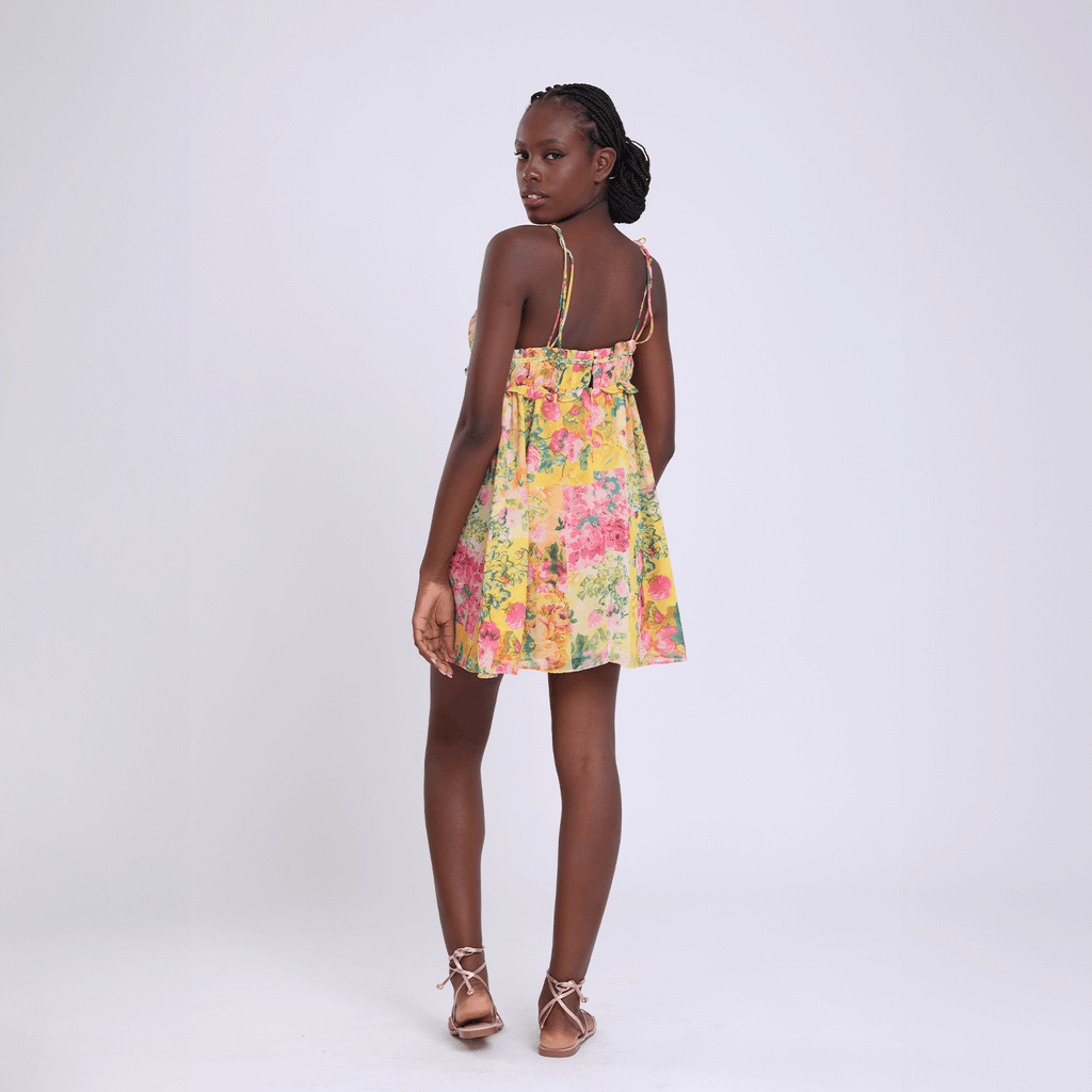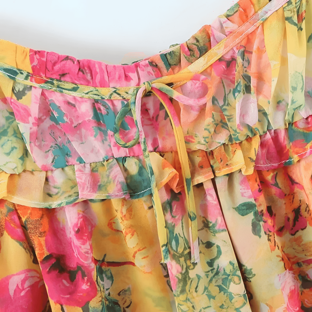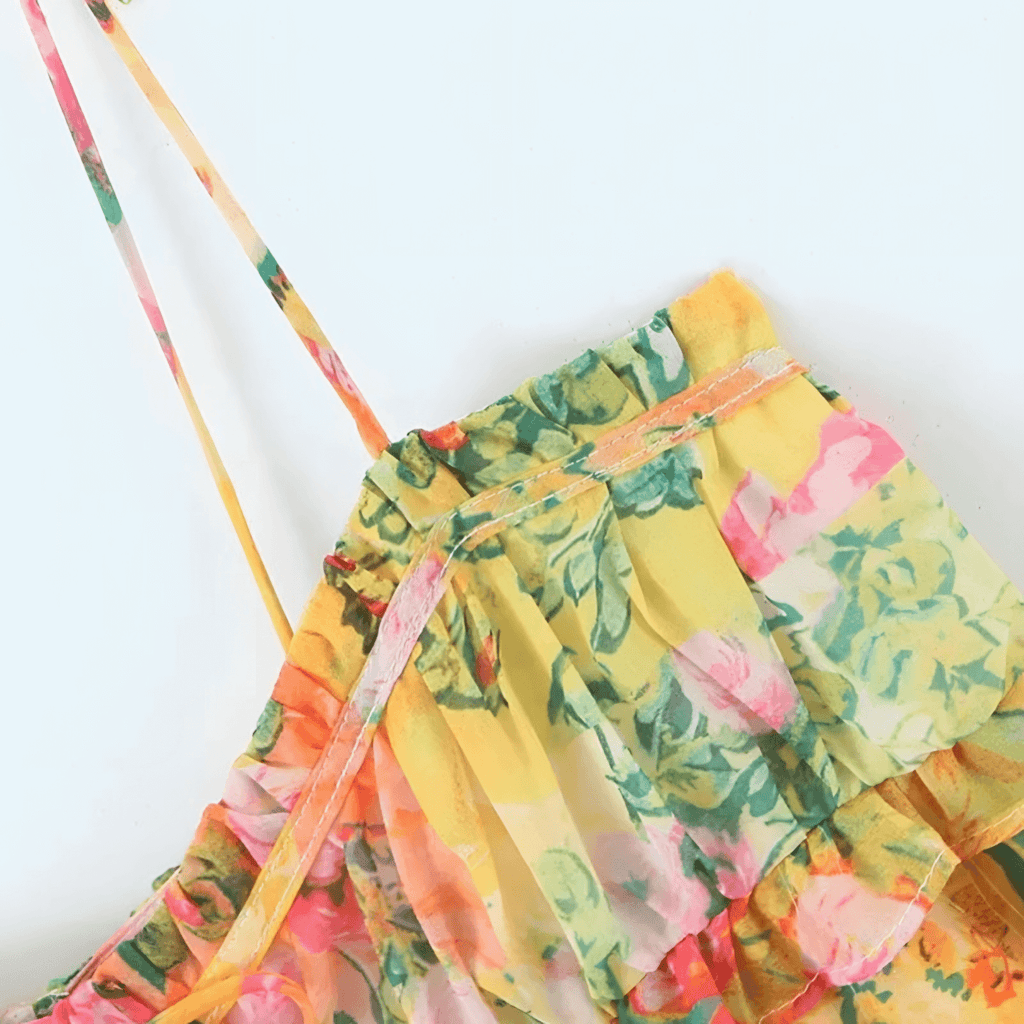 Vestido floral com alças finas ajustáveis, camada dupla com babados e fecho em laço frontal. Textura leve e fluida.