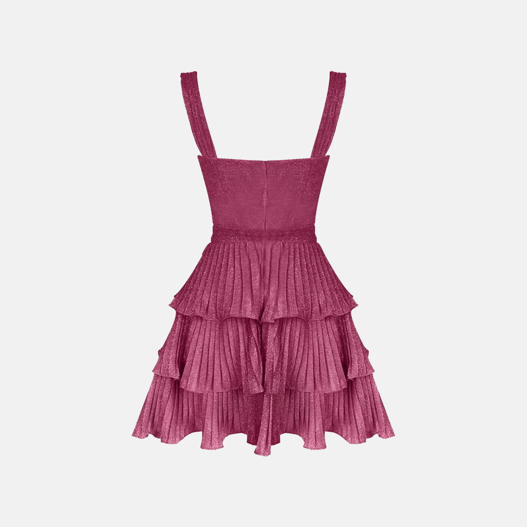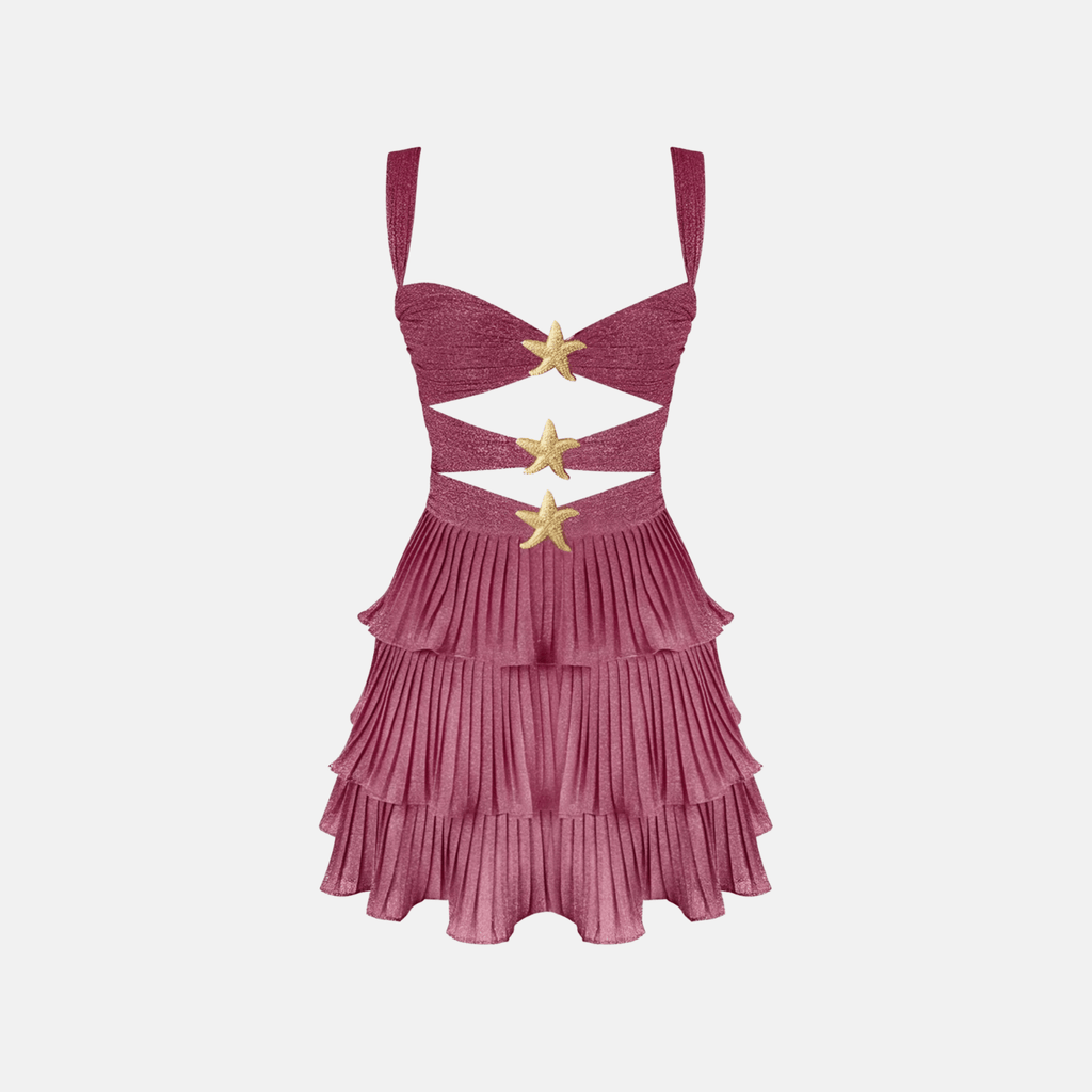 Vestido curto plissado com camadas de babados. Detalhe de recortes frontais com três estrelas do mar decorativas em metal. Alças largas ajustáveis e fechamento posterior invisível.
