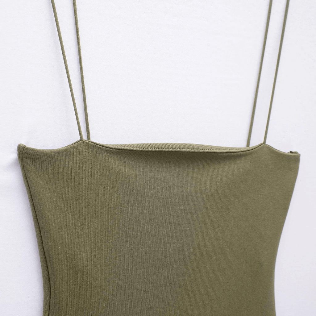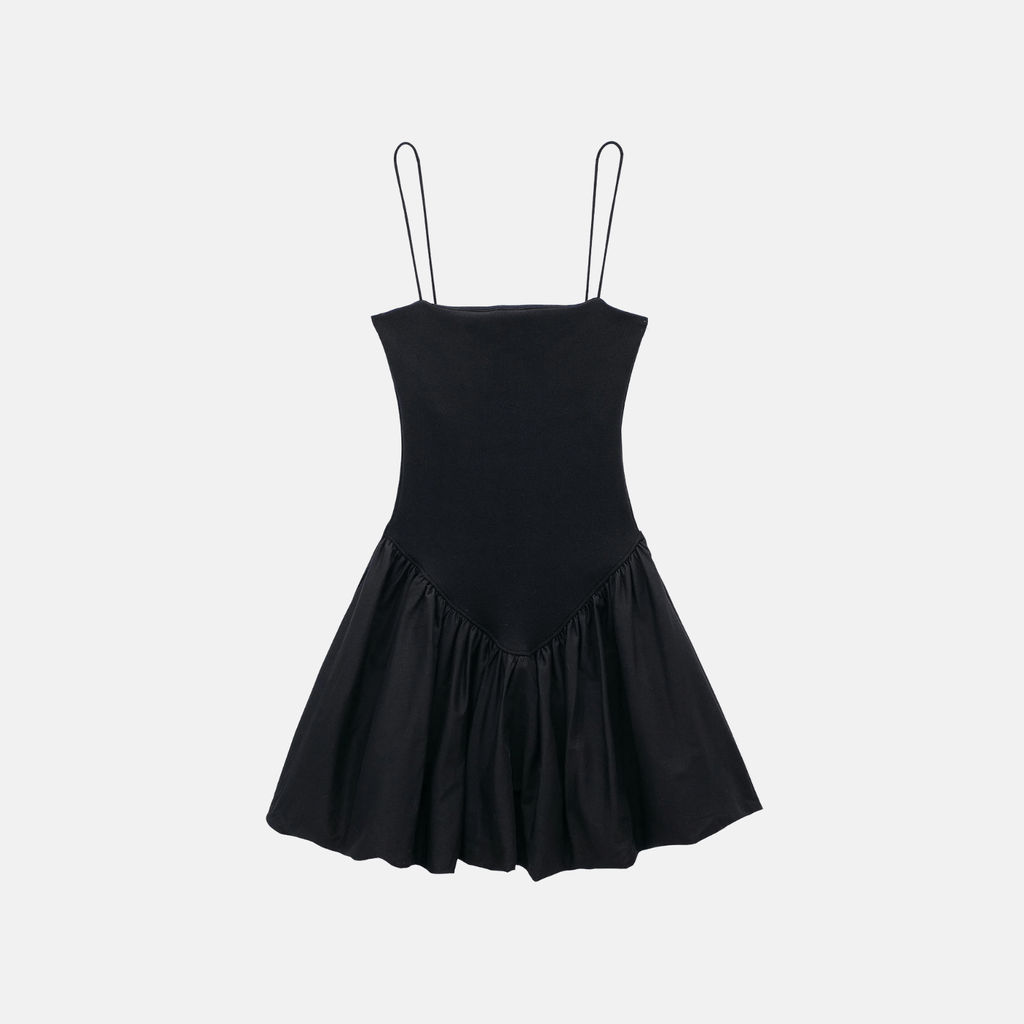 Vestido curto com alças finas, parte superior ajustada e saia rodada em V com detalhe franzido. Disponível em preto, branco e verde.