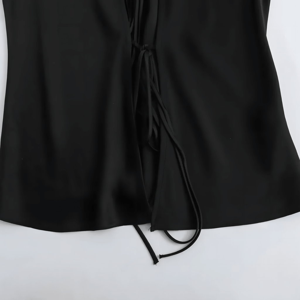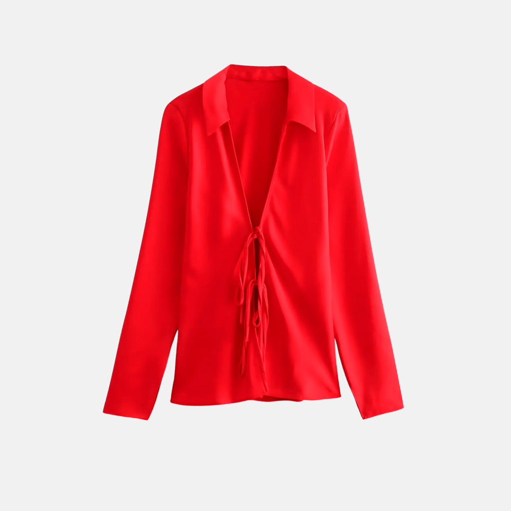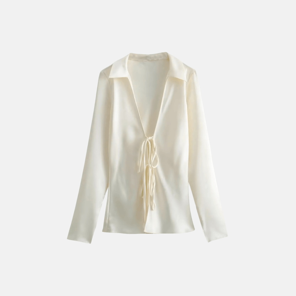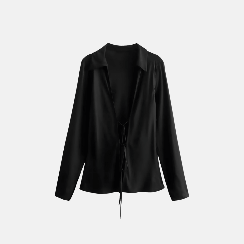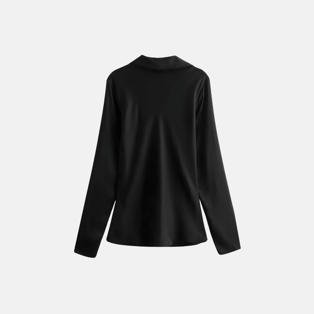 Blusa de manga longa com tecido acetinado. Gola clássica e fechamento ajustável por laços na parte frontal. Caimento leve e acabamento refinado. Costuras discretas para um visual elegante.