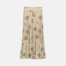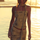 Conjunto de saia longa reta com cintura alta e top tomara que caia, ambos em tule bordado com miçangas e paetês, detalhes geométricos, acabamento forrado e faixa removível.