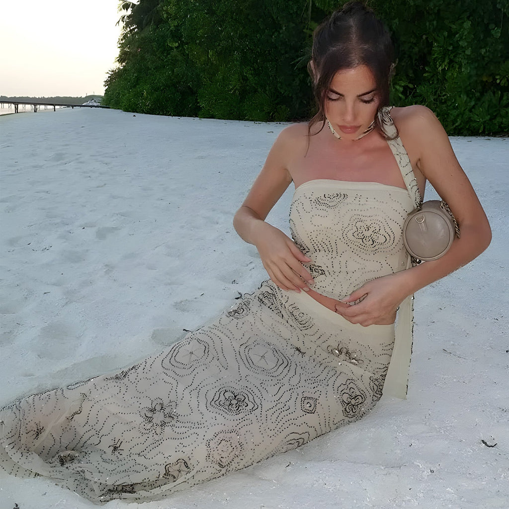 Saia longa de cintura alta, modelagem reta, tule bordado com miçangas e paetês, desenhos geométricos em toda a peça e acabamento forrado.