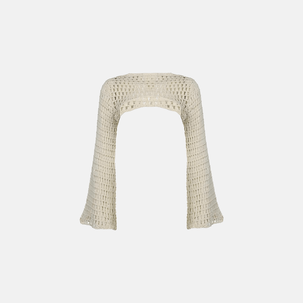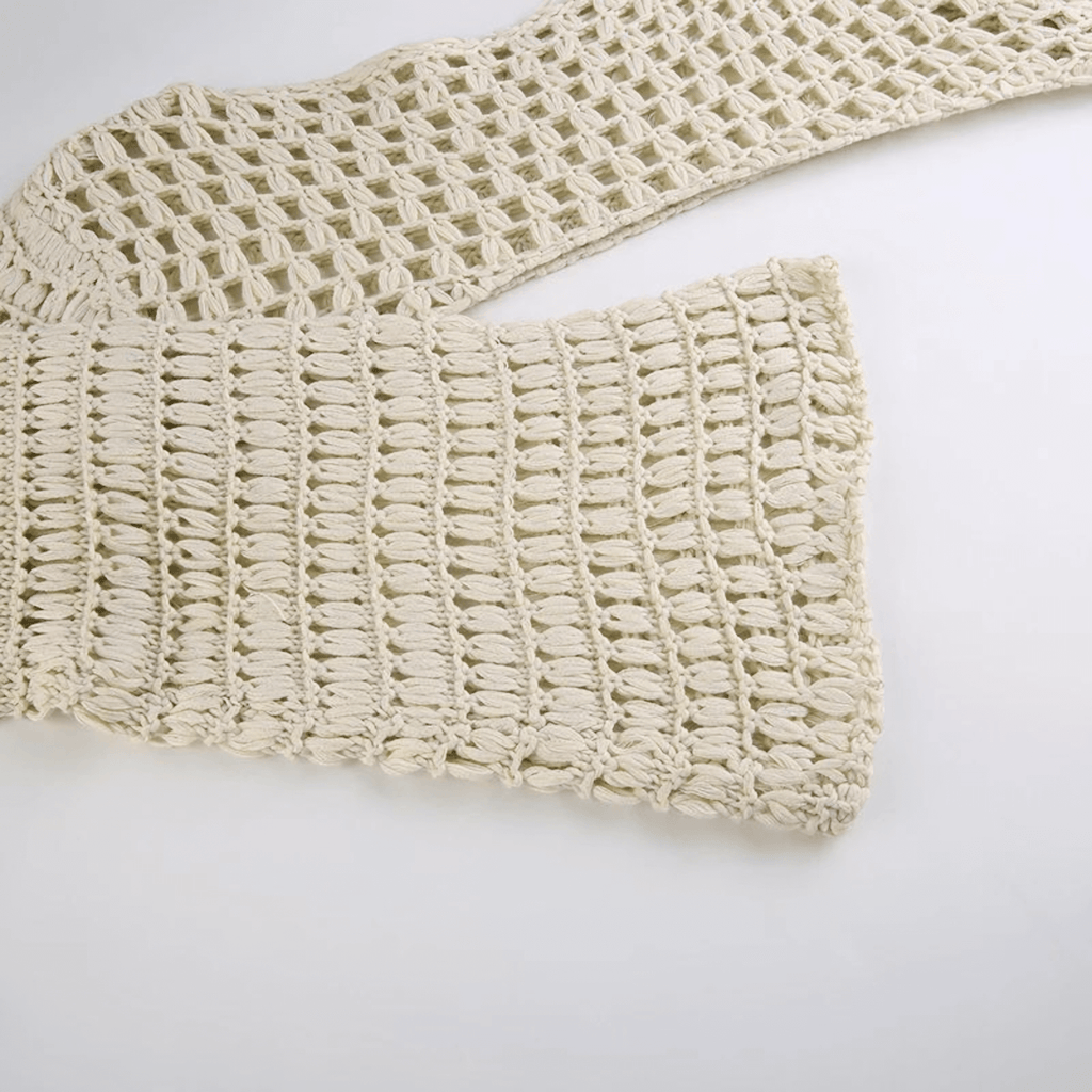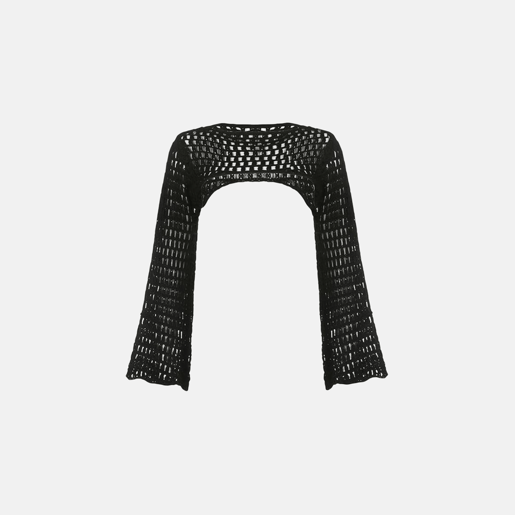 Sobreposição de crochê com mangas longas e boca de sino. Padrão vazado em preto. Sem fecho, estilo solto.