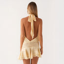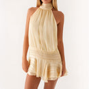 Vestido longo com recortes e fendas nas laterais. Decote profundo com alças finas cruzadas nas costas. Tecido fluido com leve brilho e toque sedoso. Modelagem ajustada na cintura e saia evasê.